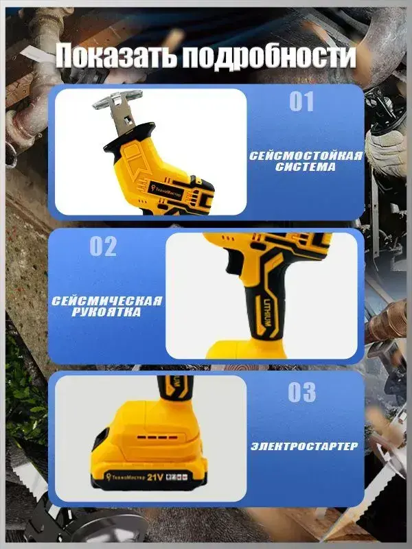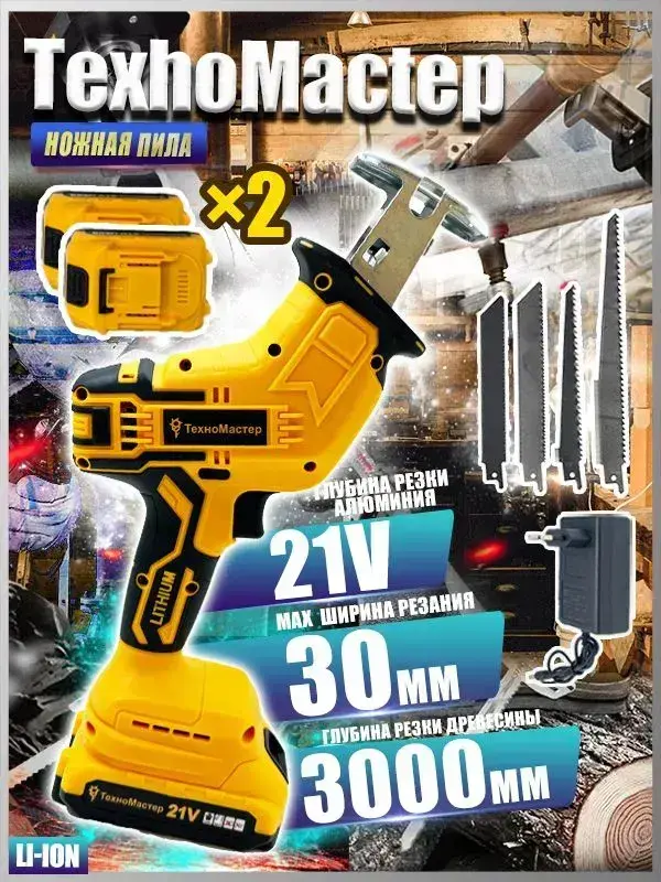 ТехноМастер TooL Аккумуляторная электрическая сабельная пила (+4 лезвия для разных видов материалов)