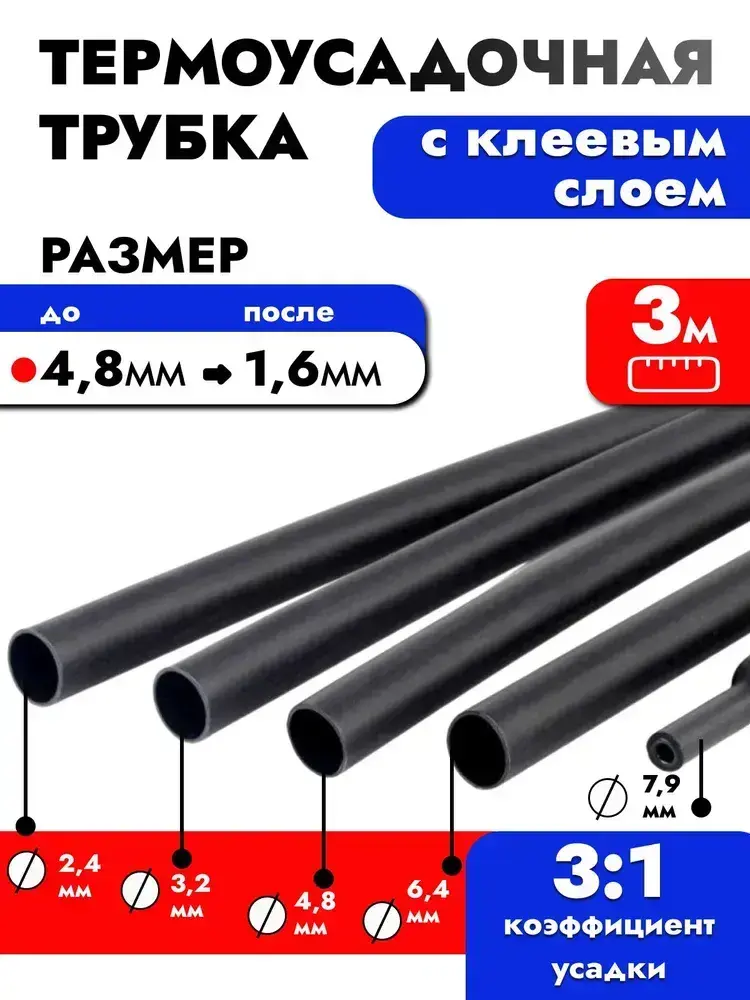 Термоусадка для проводов с клеевым слоем 3 метра черная, 4,8мм. Термоусадочная трубка для проводов. Диаметр 4,8.
