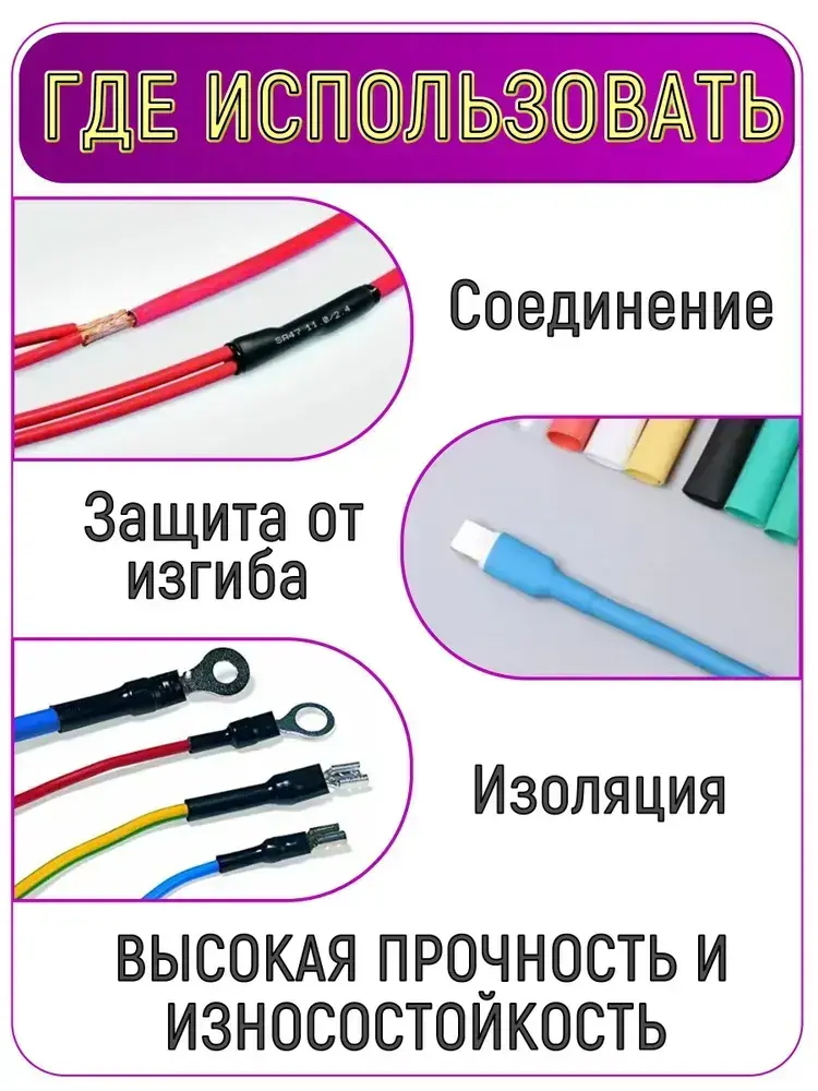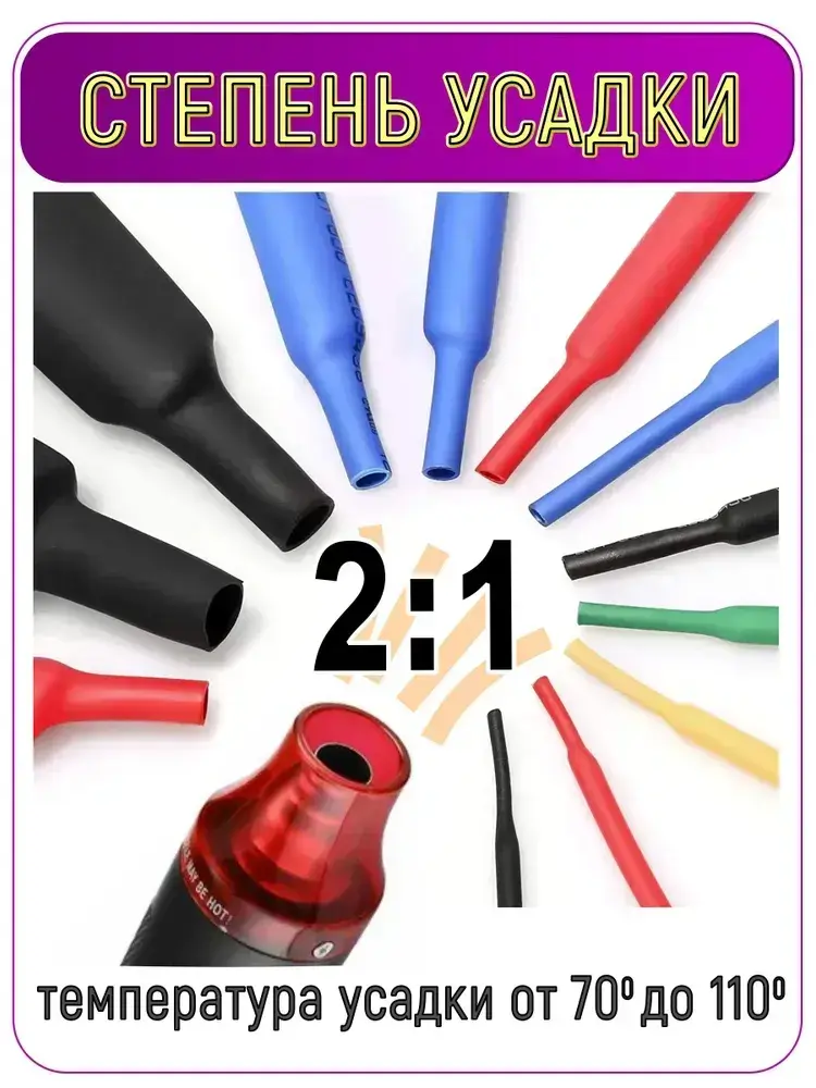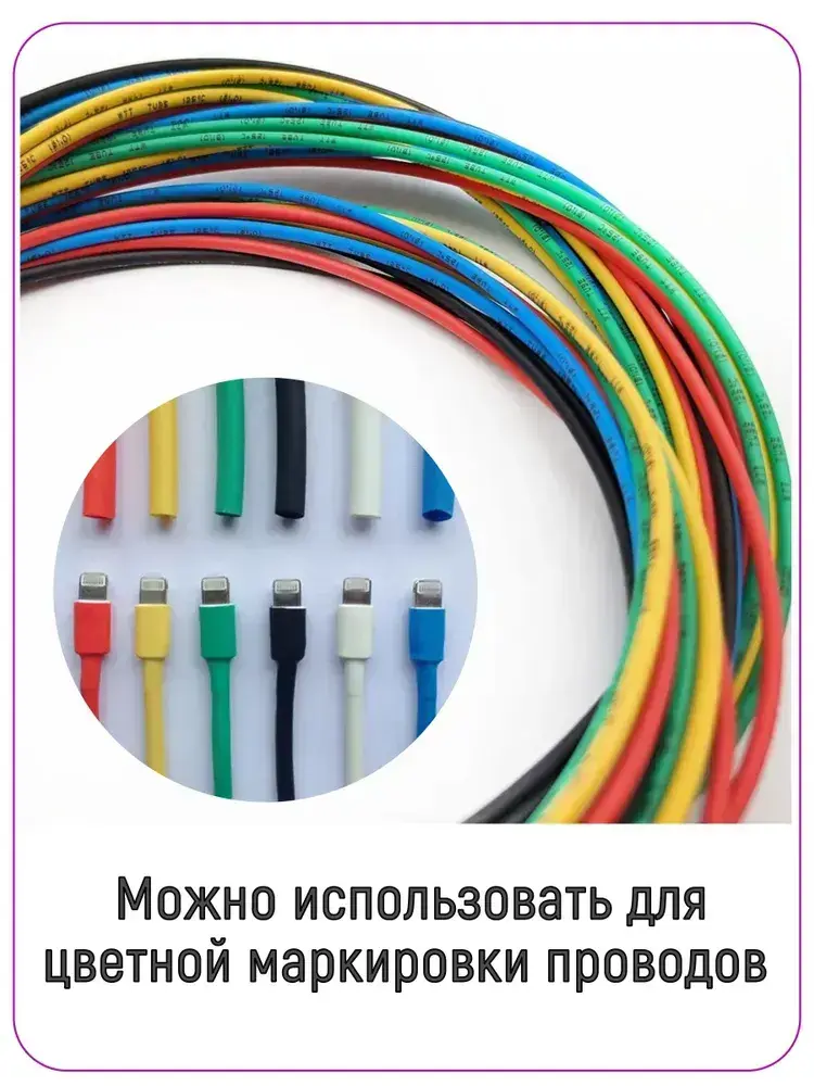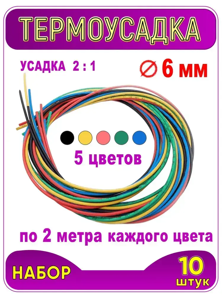 Термоусадка ф 6 мм, длина 1 метр, 10 шт. Черный, синий, желтый, красный, зеленый. 6 / 3 мм (2:1). Термоусадочная трубка