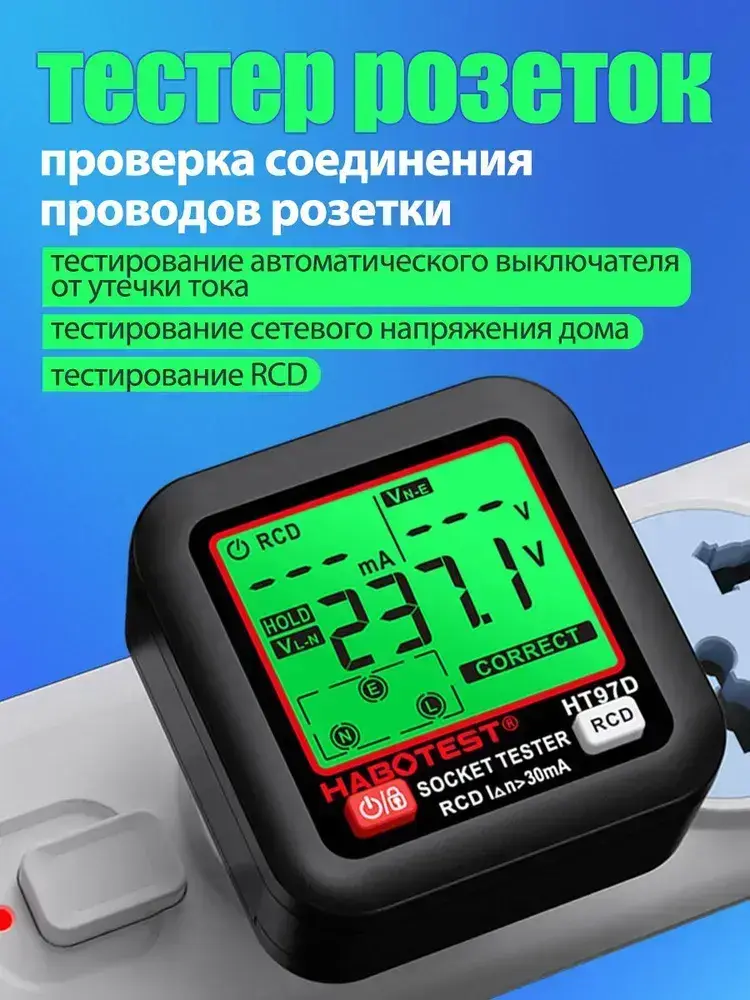 Тестер розеток и УЗО ,С индикацией с использованием LED и ЖК-дисплеем, позволяющими показывать значения теста УЗО (реляс ущелочного защиты), напряжение в сети и ток утечки,Розетка европейского типа