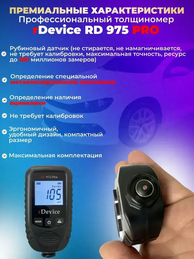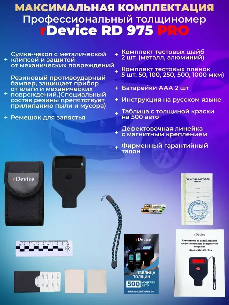 Толщиномер для авто rDevice 975 PRO с чехлами, металлизированная шпатлевка, определение оцинковки, рубиновый датчик, все металлы