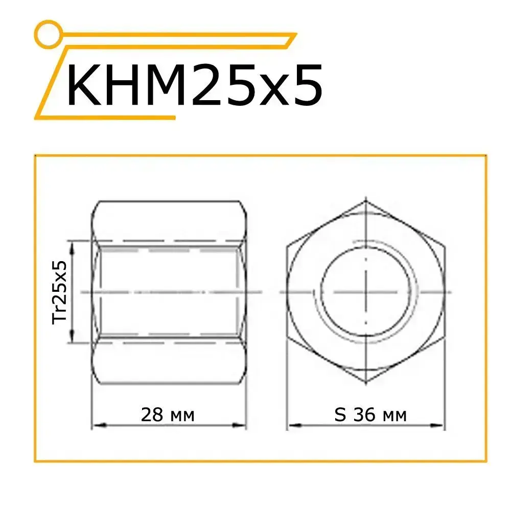 Трапецеидальная гайка металлическая шестигранная KHM25x5