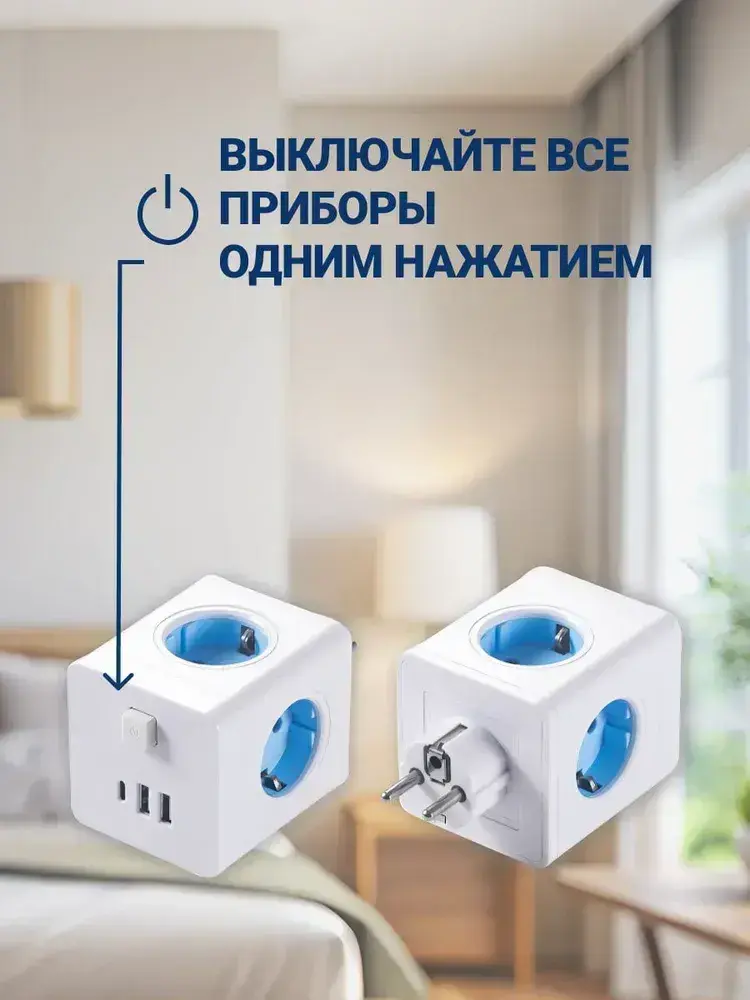 Тройник для розетки КУБ с USB и Type-c, 4 розетки, разветвитель электрический MartyHome с выключателем