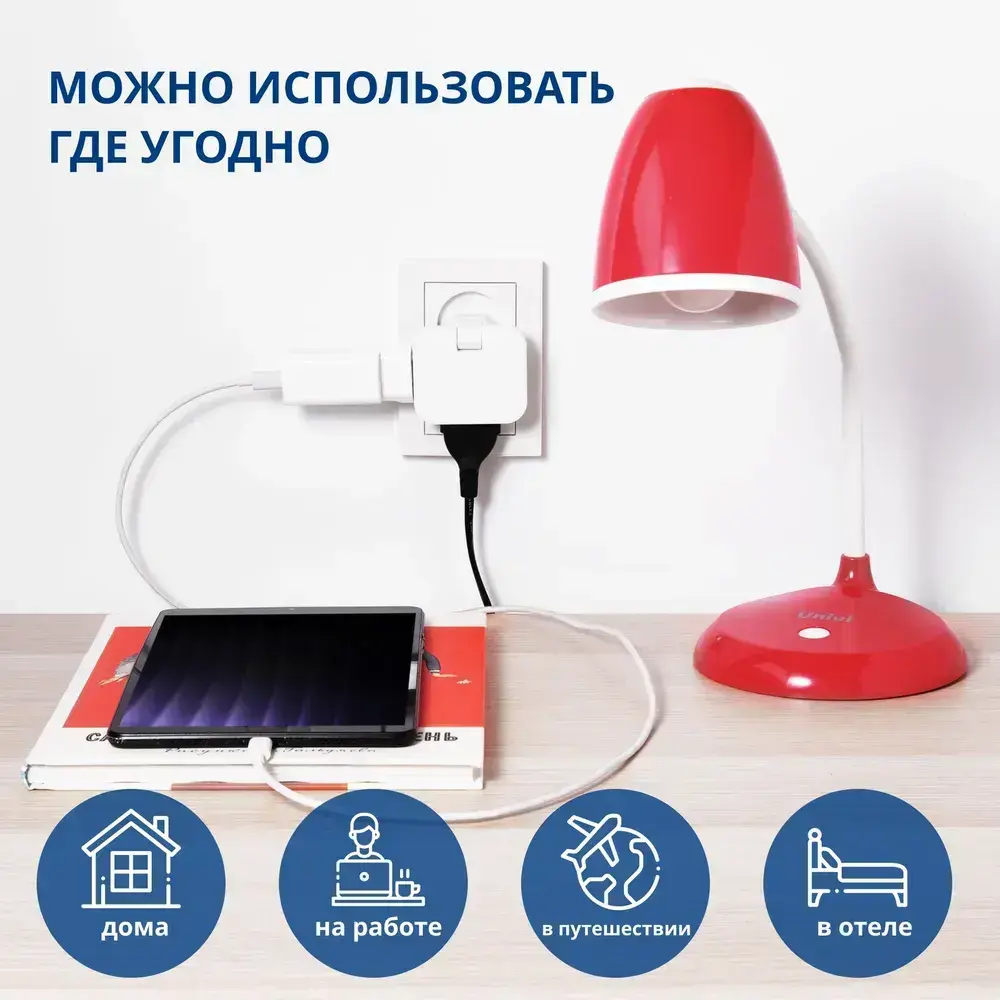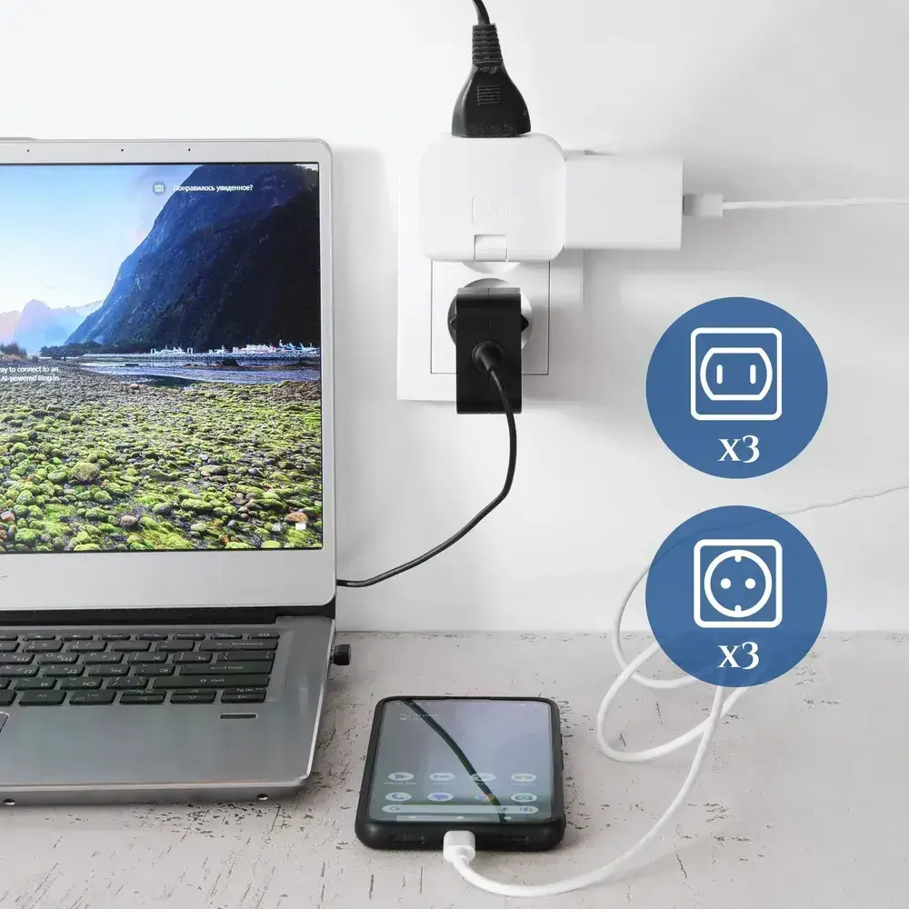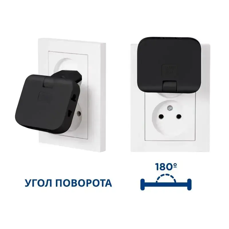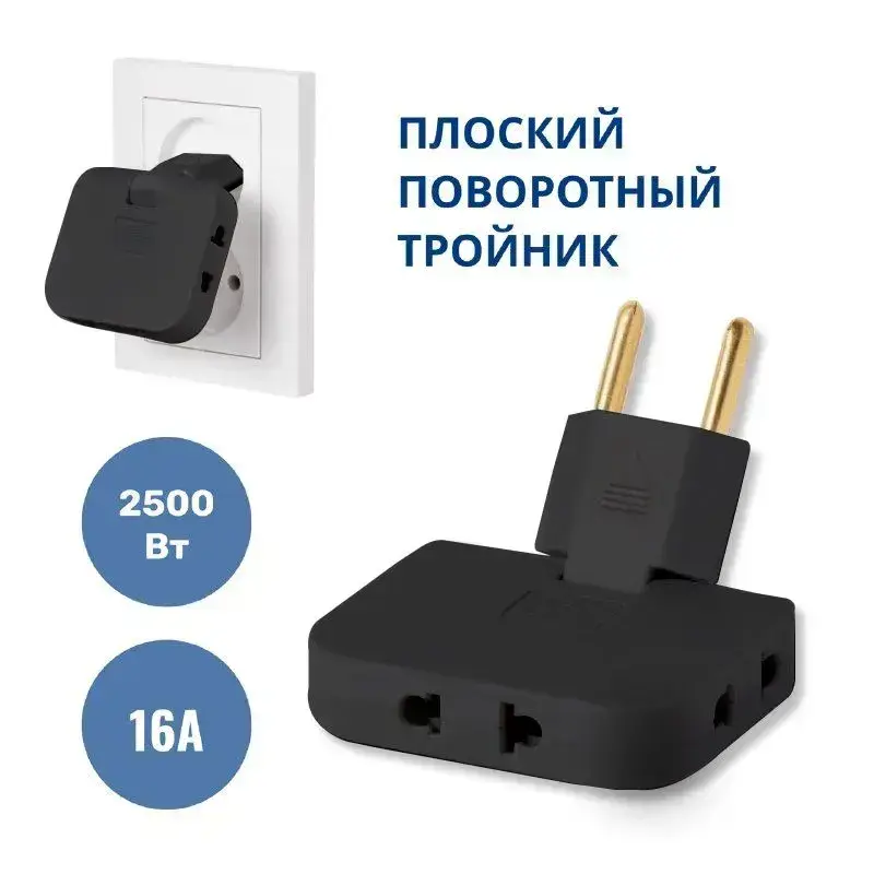 Тройник для розетки плоский поворотный, разветвитель 180 градусов, черный