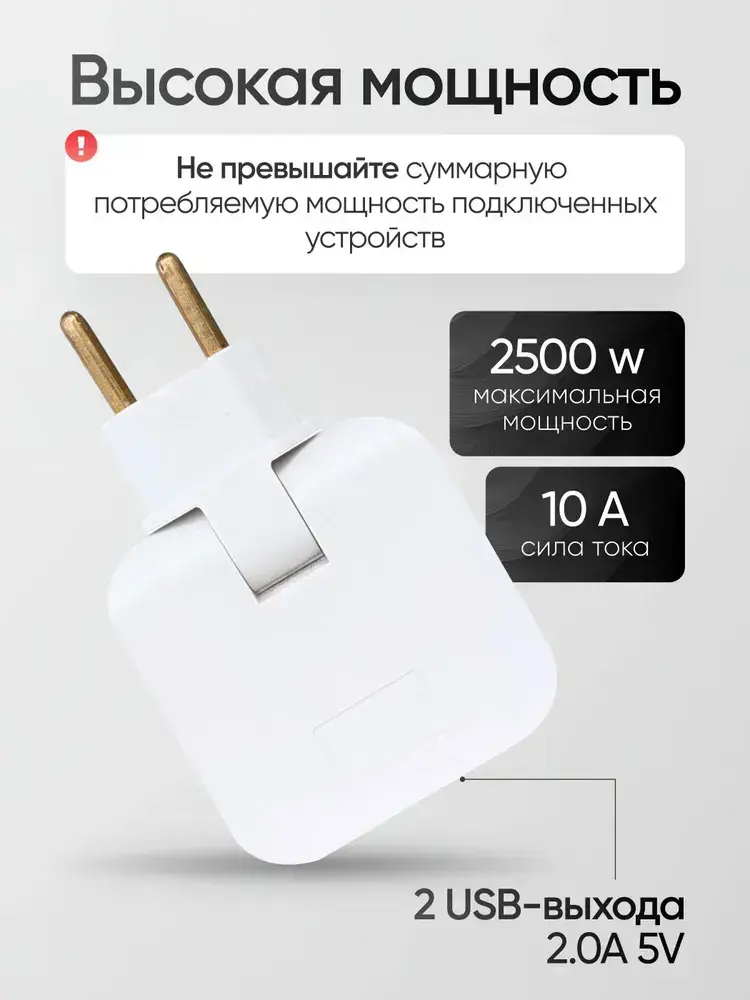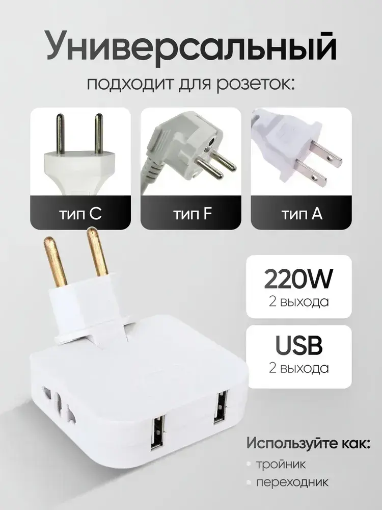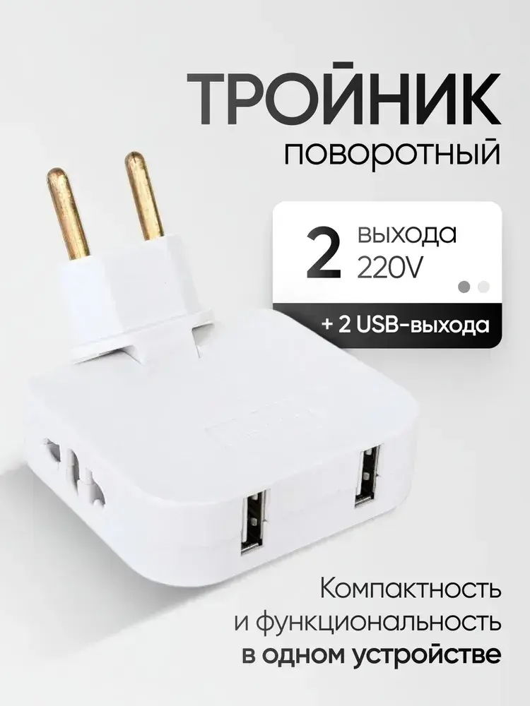 Тройник для розетки с USB плоский поворотный на 180 градусов, разветвитель электрический