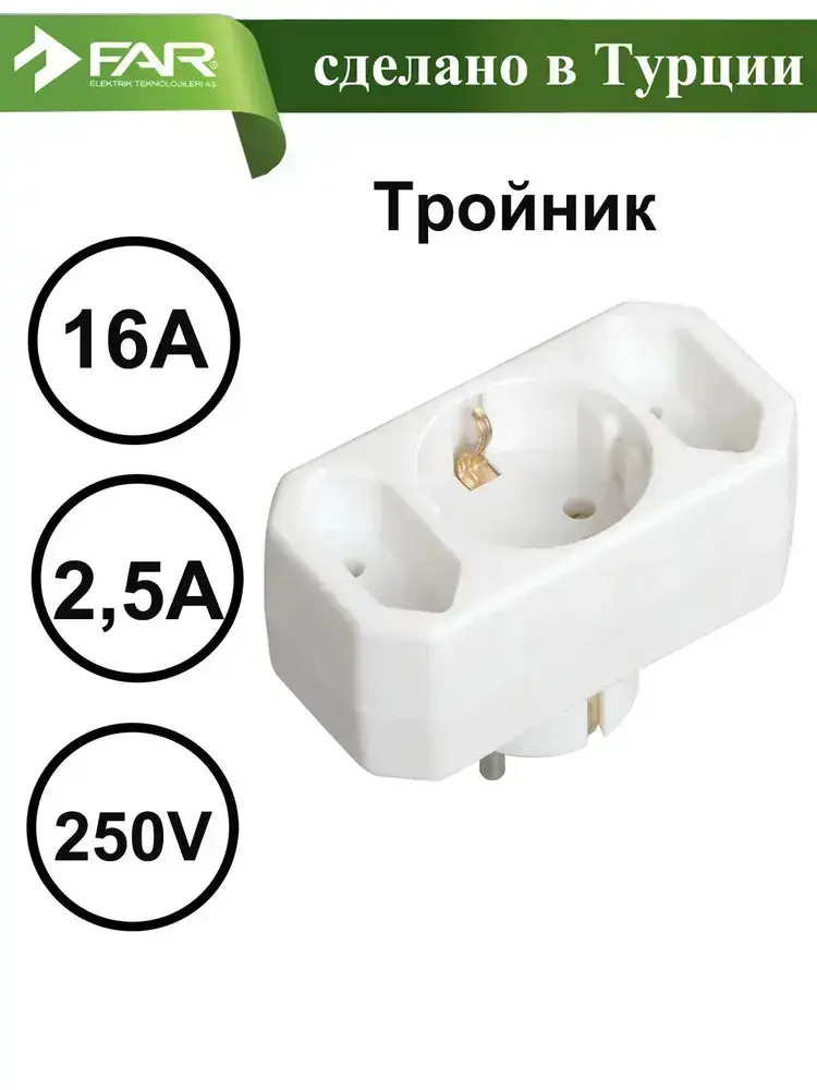 Тройник электрический для розетки 2 плоских б/з и одна круглая с с/з розетка
