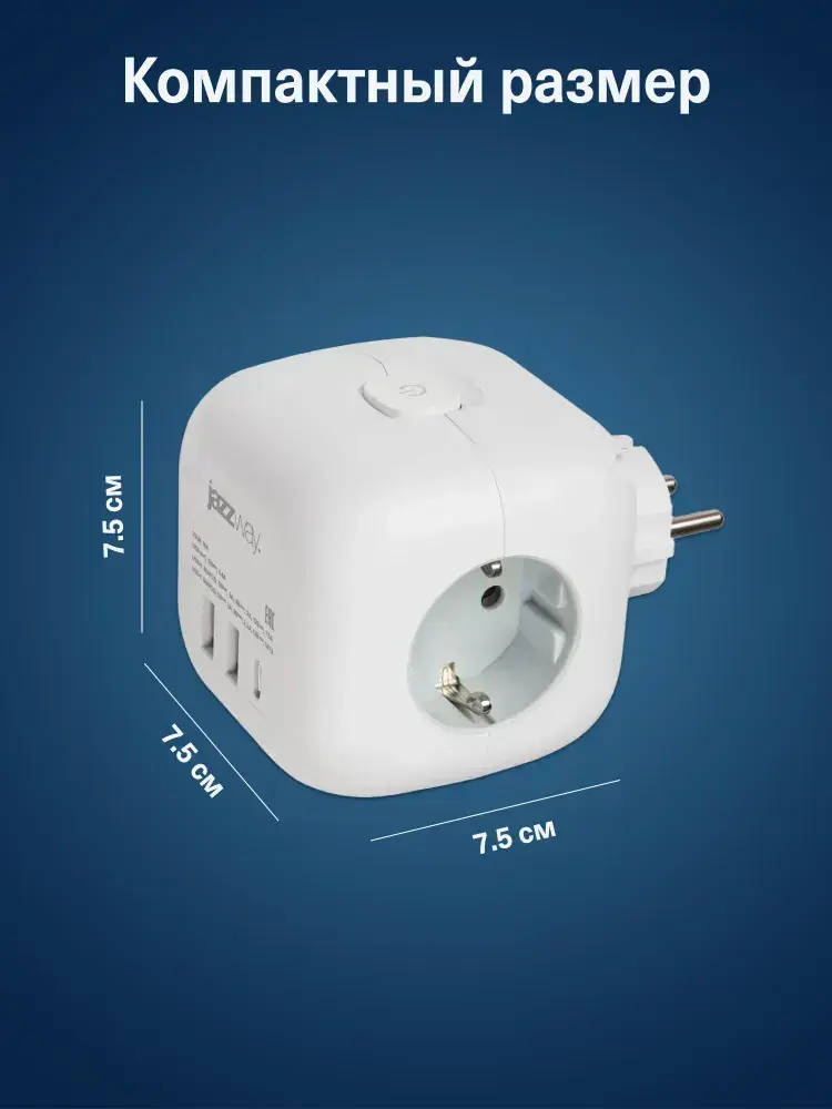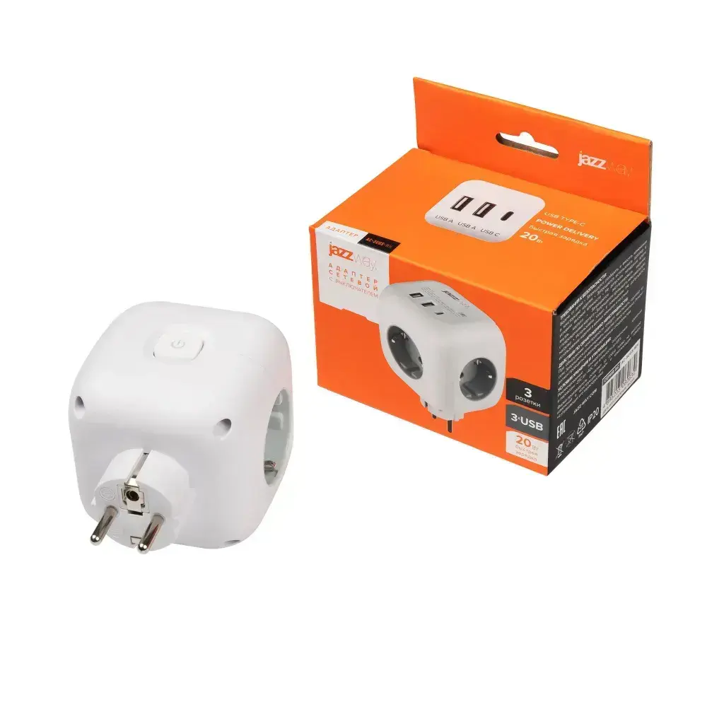 Тройник на 3 розетки / разветвитель 2 USB + 1 TYPE-c быстрая зарядка с выключателем Jazzway