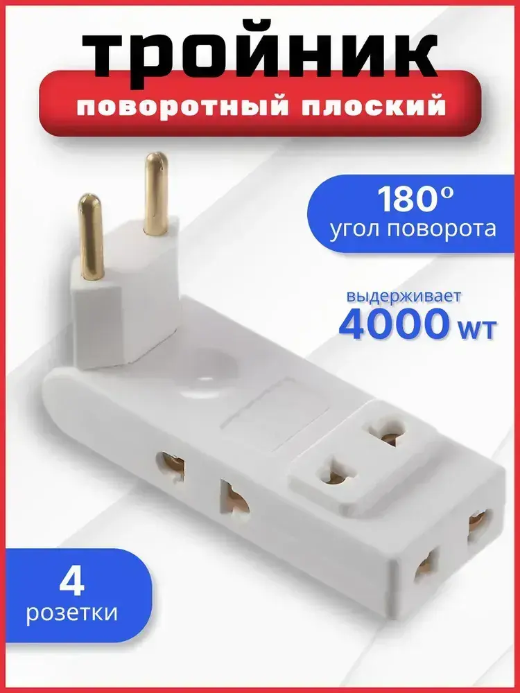 Тройник плоский поворотный 4 розетки усиленный, разветвитель 180 градусов, переходник