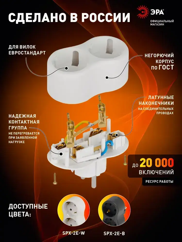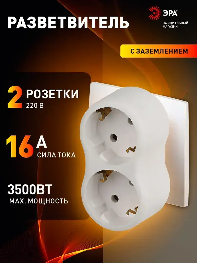 Тройник розетка электрический SPx-2e-W ЭРА / Разветвитель электрический с заземлением, 2 розетки, 16А, белый