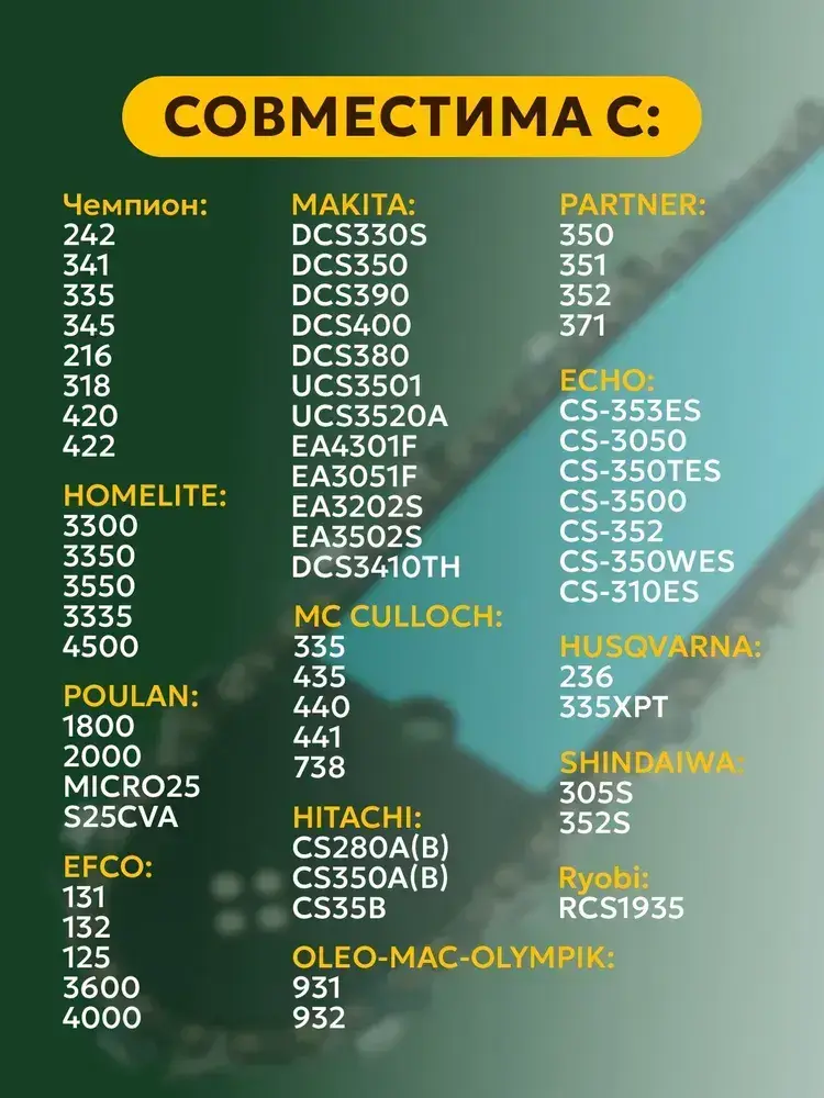 Цепь пильная 52 звена Длина шины- 14"/35см Шаг цепи - 3/8" Толщина ведущего звена - 1,3 мм