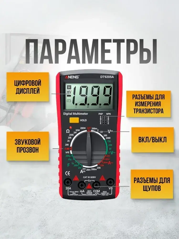 Цифровой мультиметр DT9205A с прозвонкой тестер тока и напряжения до 600В, портативный вольтметр и амперметр, токоизмерительный прибор для авто, электромонтажа и дома