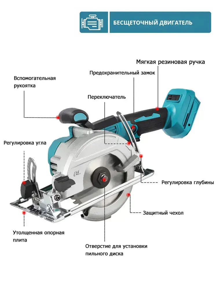 Циркулярная аккумуляторная бесщеточная дисковая пила одноручная,0 акб