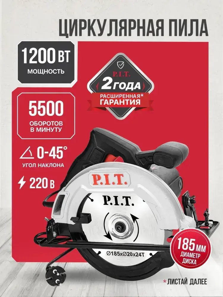Циркулярная пила (дисковая) P.I.T. PKS185-C4, 185мм, 1200Вт, 5500 об/мин, 61мм пропил