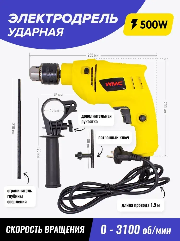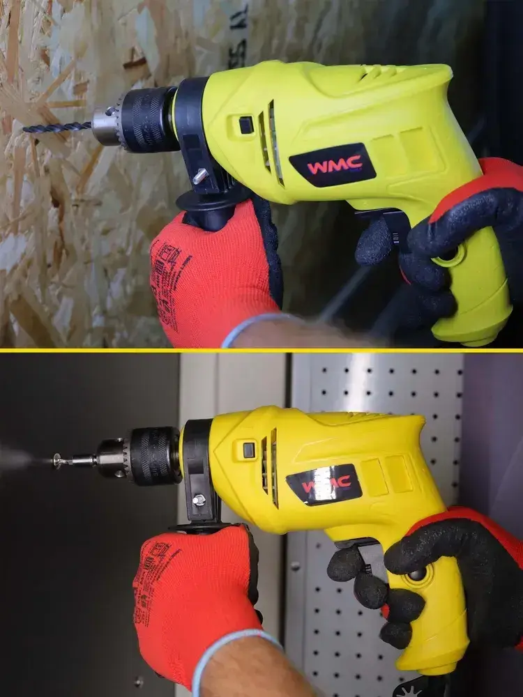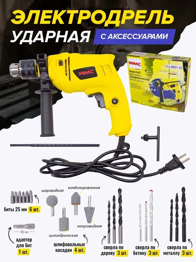 Ударная дрель с набором сверл бит насадками и дополнительными аксессуарами