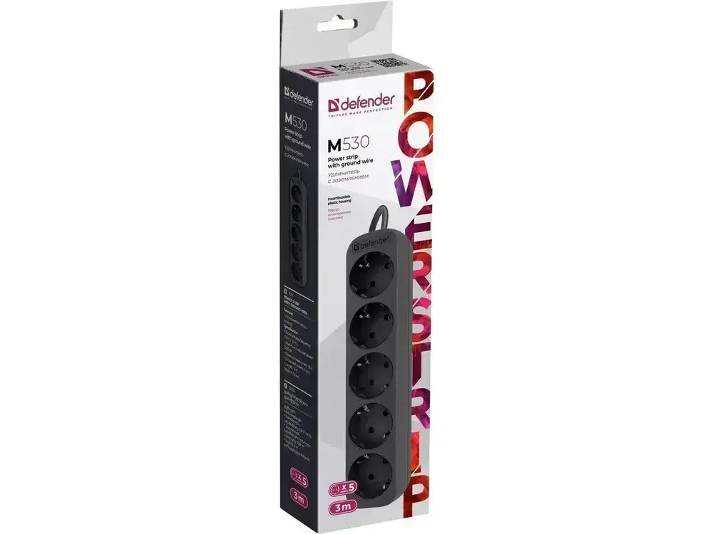 Удлинитель Defender M530, 5 розеток, 3 м, черный