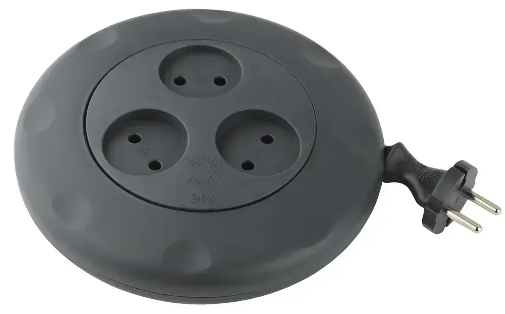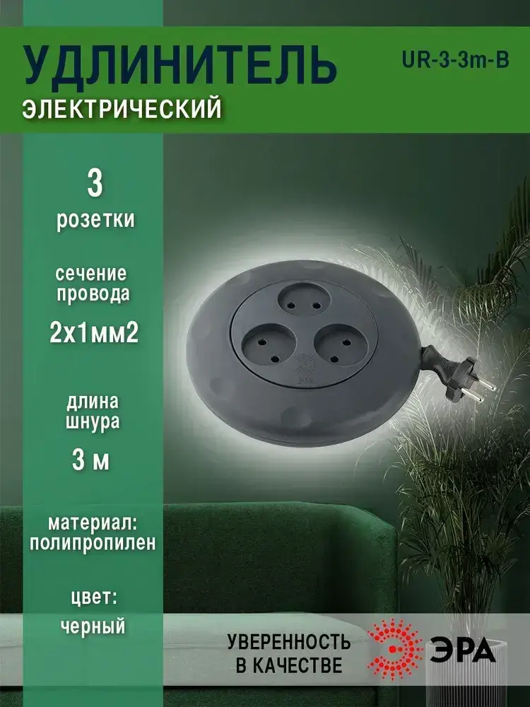 Удлинитель электрический ЭРА UR-3-3m-B рулетка без заземления 3 розетки 3м 2x1мм2 10А черная