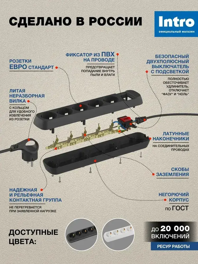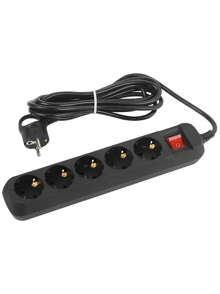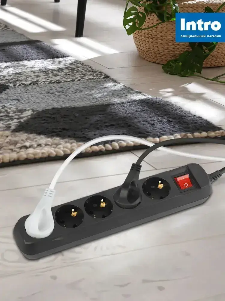 Удлинитель электрический Intro UES515-B с заземлением с выключателем 5 розеток 1,5 м ПВС 3х0,75мм2 10А черный