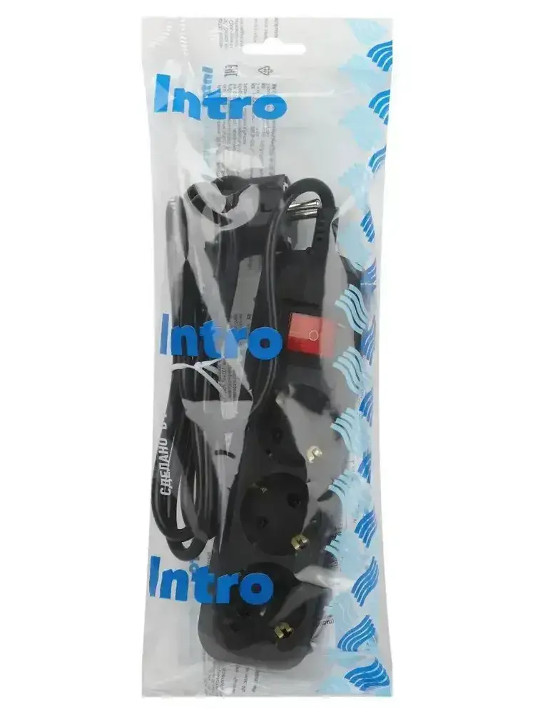 Удлинитель Intro UES315-B сетевой электрический бытовой с заземлением с выключателем 3 розетки, 1,5 м, ПВС 3х0,75 мм2, 10А, черный