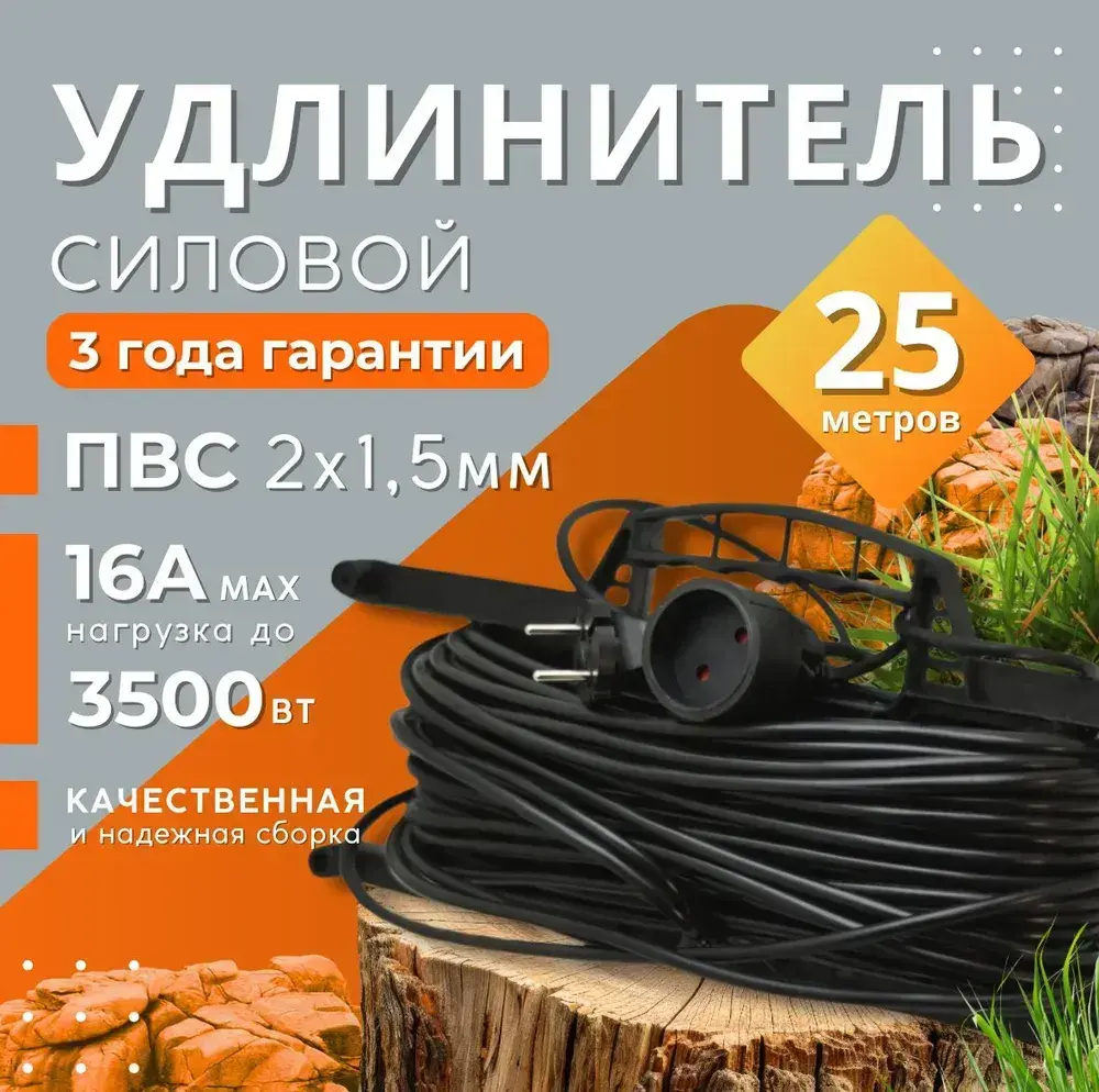 Удлинитель на рамке уличный силовой для сварки ПВС 2х1.5 мм 25 метров, влагозащитный литой штепсель для газонокосилки и триммера. Строительный удлинитель 25 метров, 1 гнездо черный