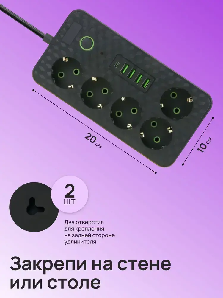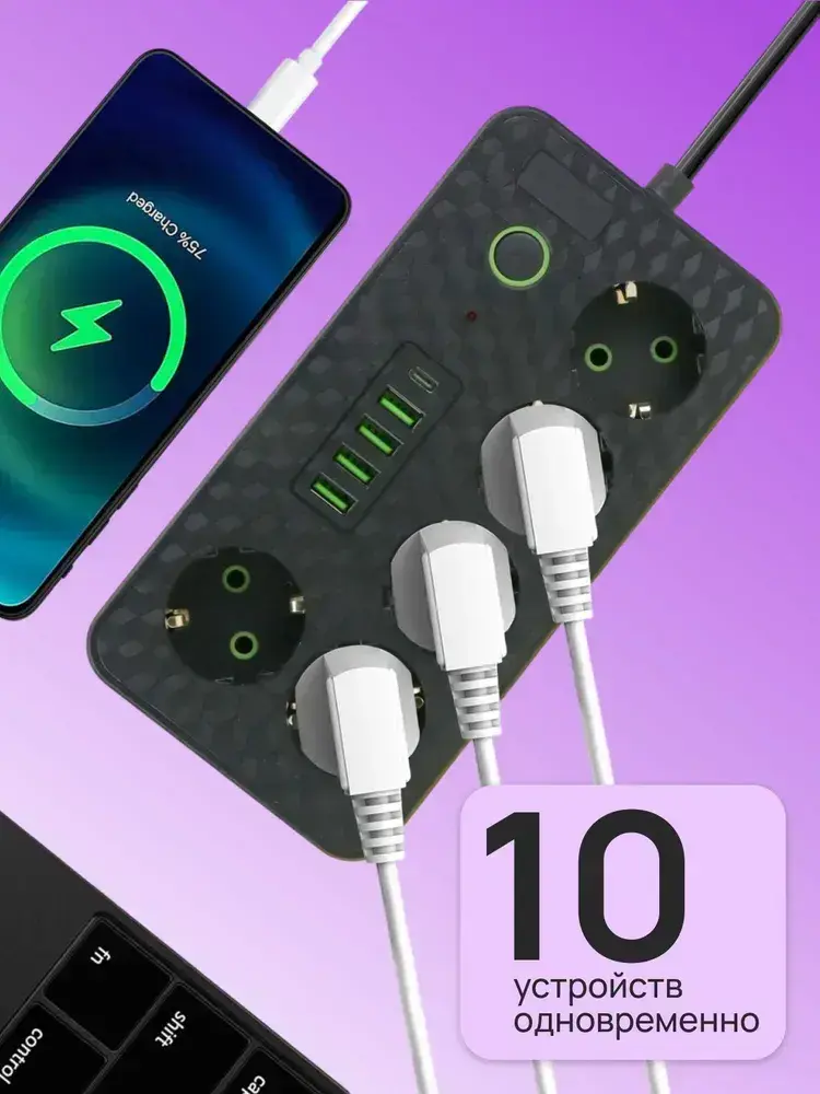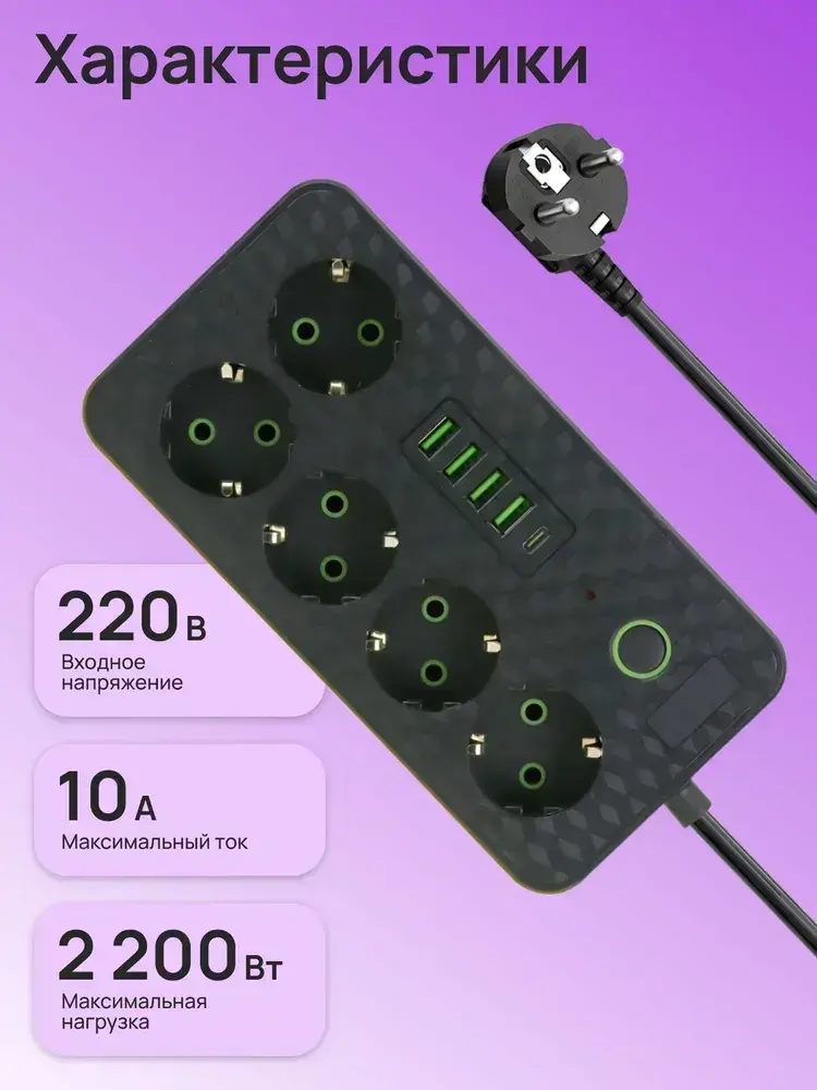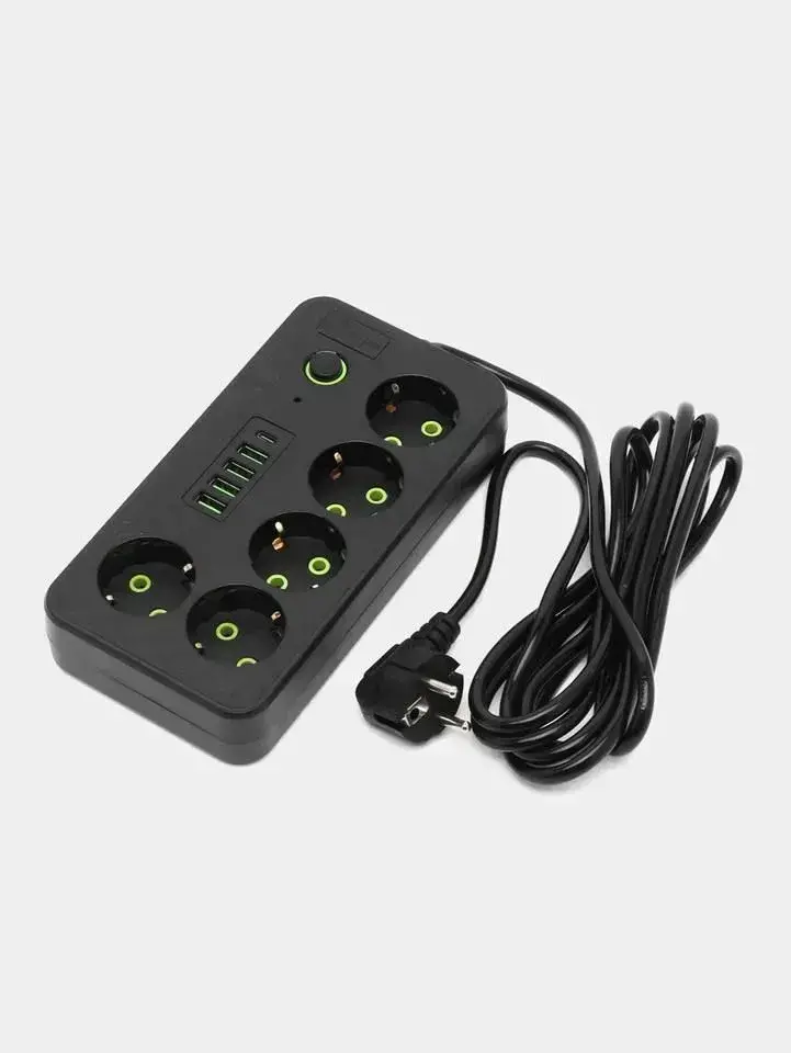 Удлинитель с выключателем 5 метров, сетевой фильтр с 5 розетками, 4 портами USB и 1 Type-C, пилот, тройник