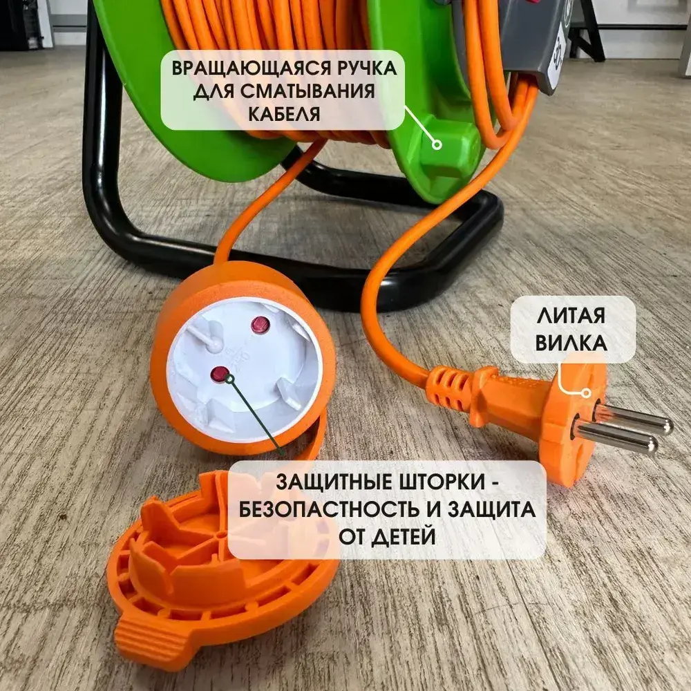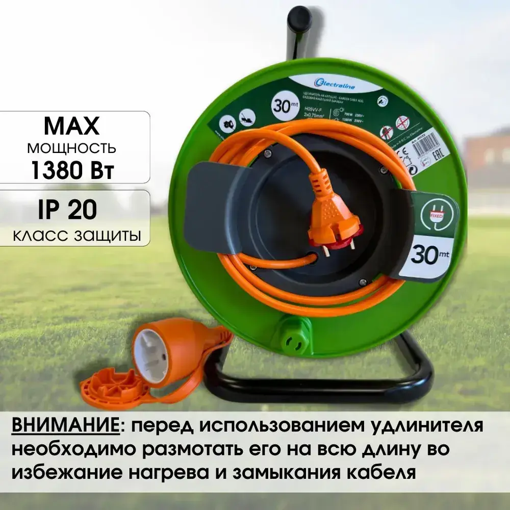 Удлинитель садовый 30 метров для газонокосилки и триммера на катушке 1 выносная розетка