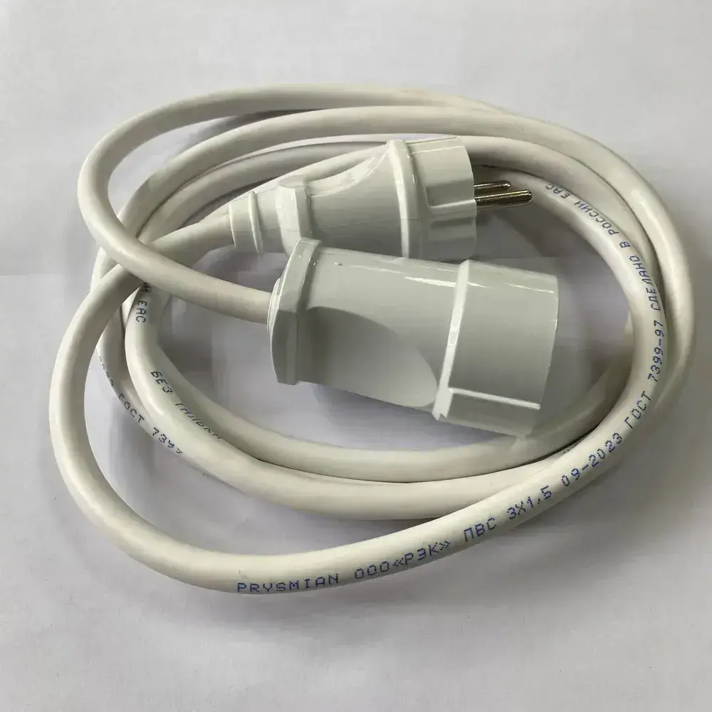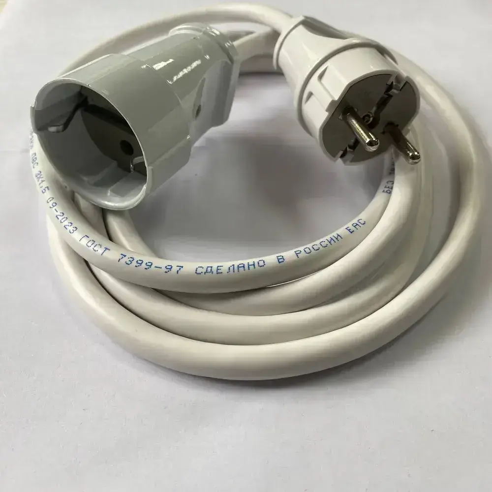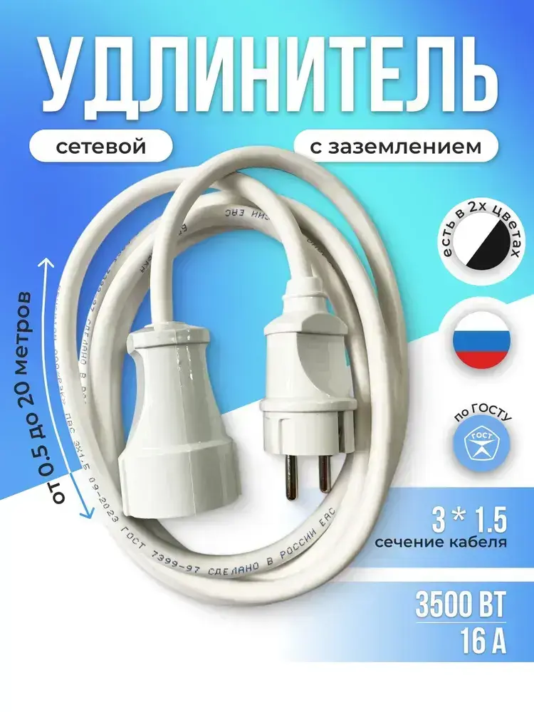 Удлинитель сетевой 3м с заземлением с одной розеткой IP20 16А ПВС ГОСТ 3х1,5 удлинитель бытовой, белый