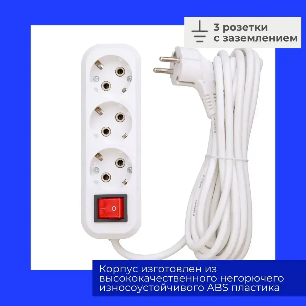 Удлинитель сетевой 5 метров с заземлением, с выключателем