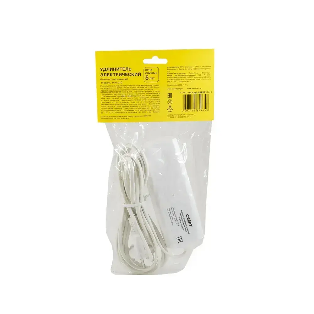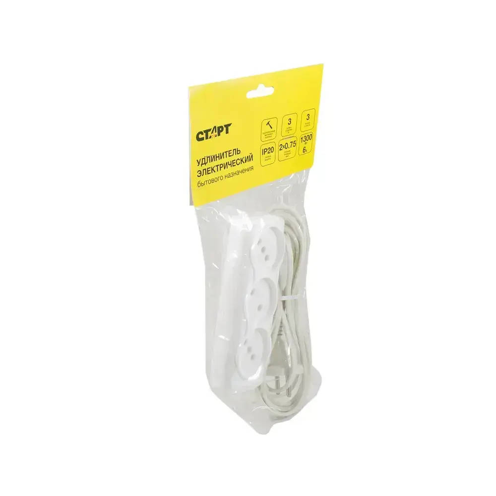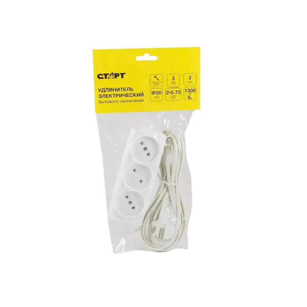 Удлинитель сетевой бытовой 3м СТАРТ 3 розетки, 6А, 1300Вт