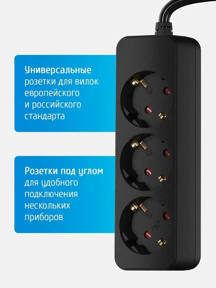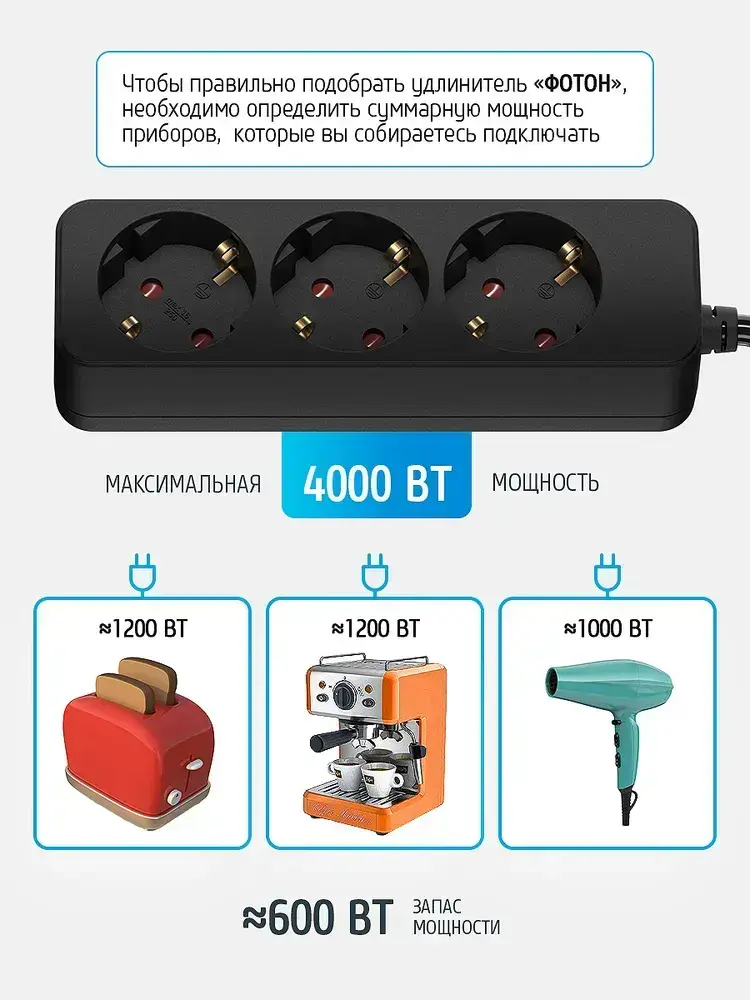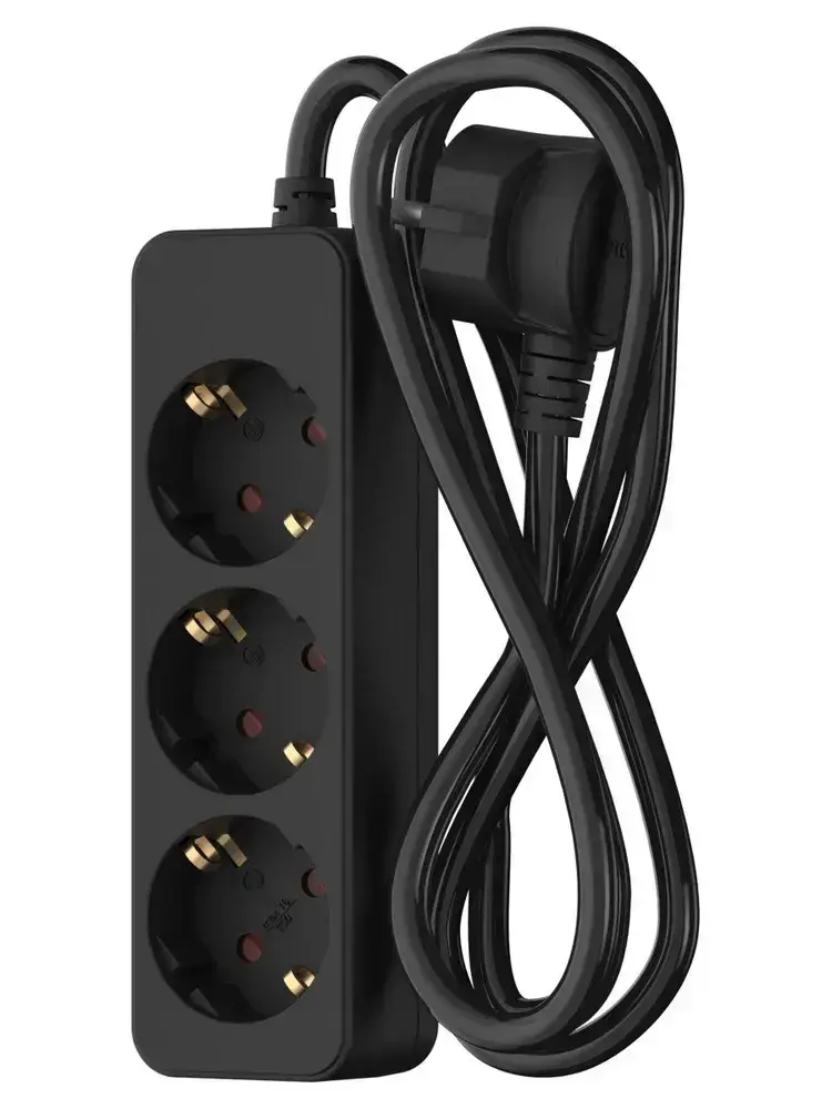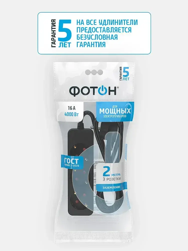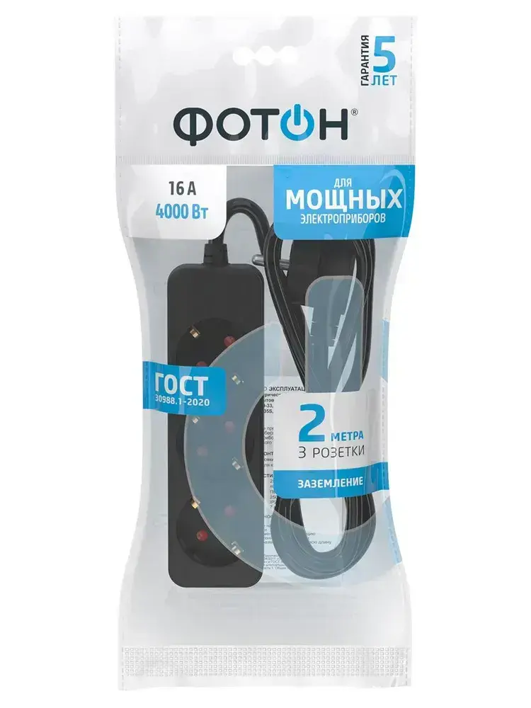 Удлинитель сетевой для розетки ФОТОН 16А 2м 3 розетки с заземлением черный, ГОСТ