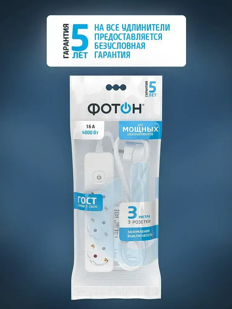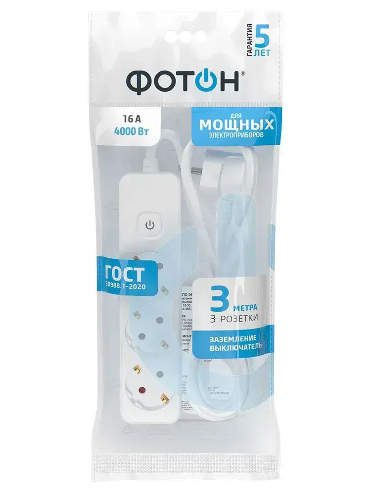 Удлинитель сетевой для розетки ФОТОН 16А 3 метра 3 розетки с выключателем с заземлением белый, ГОСТ