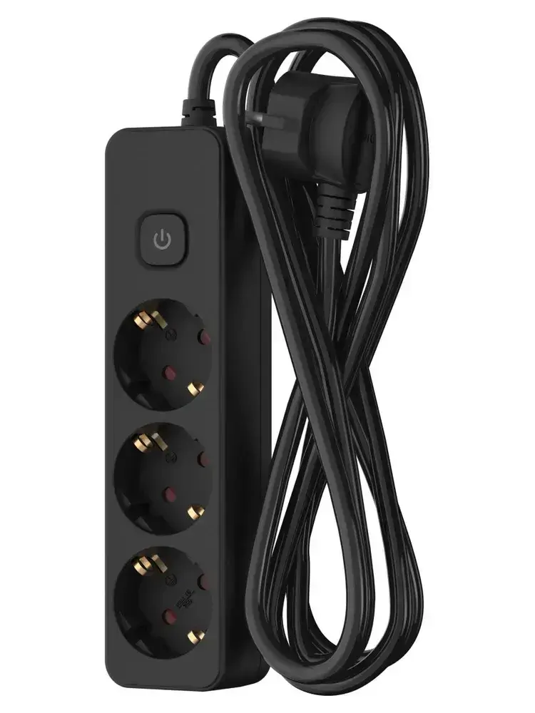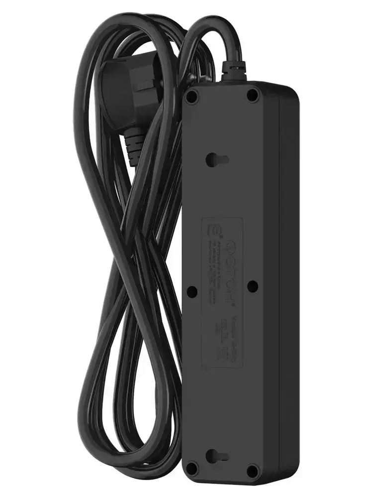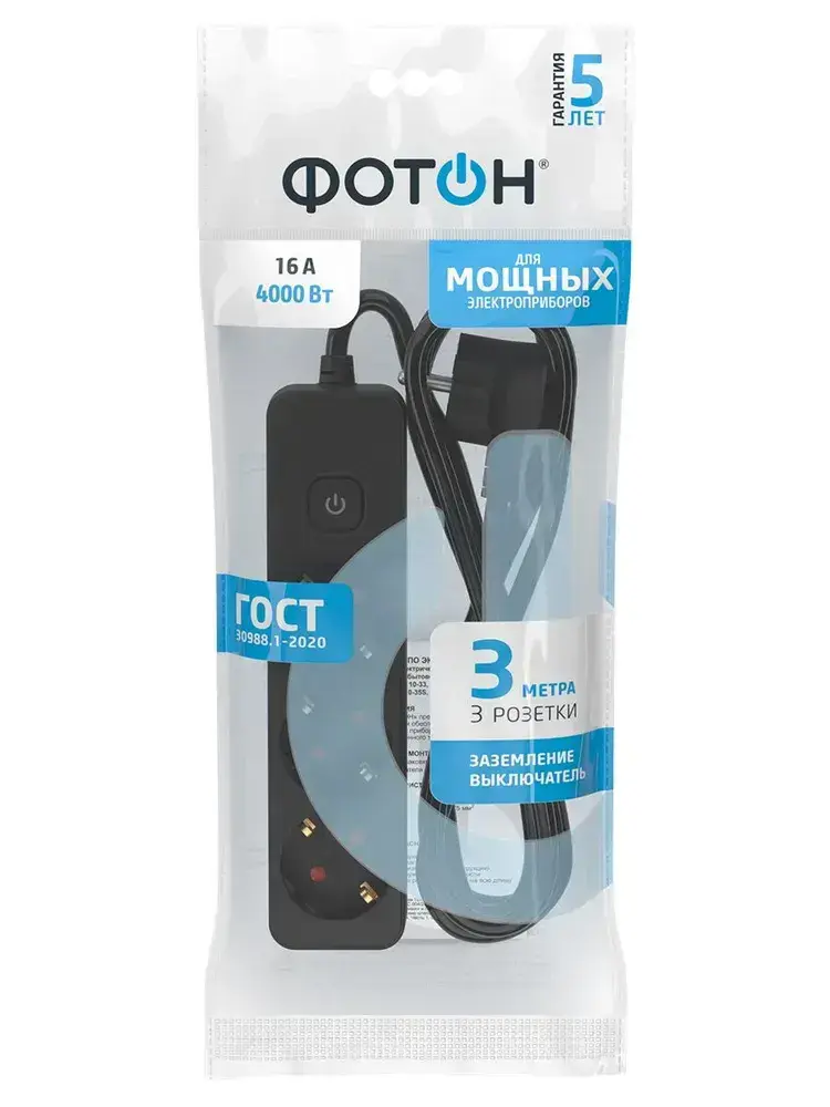 Удлинитель сетевой для розетки ФОТОН 16А 3 метра 3 розетки с выключателем с заземлением черный, ГОСТ