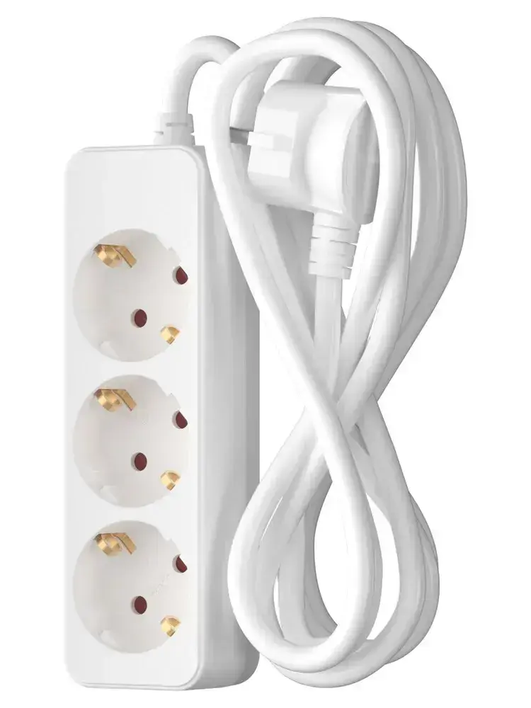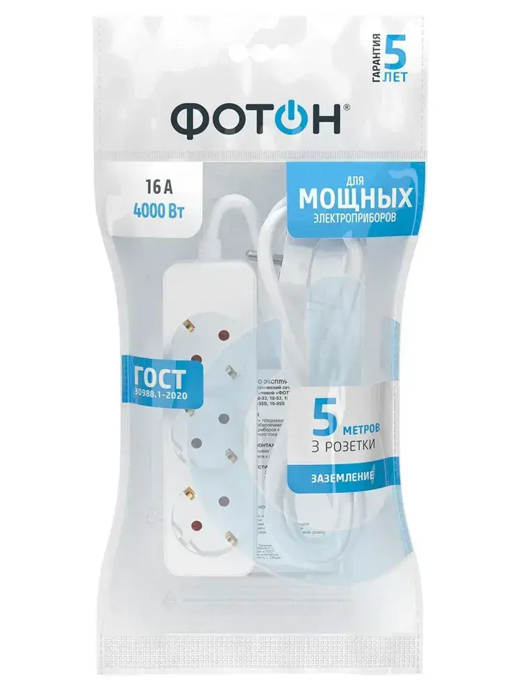 Удлинитель сетевой для розетки ФОТОН 16А 5м 3 розетки с заземлением белый, ГОСТ
