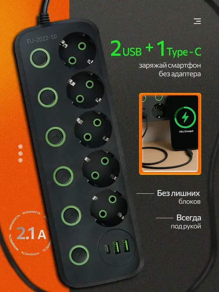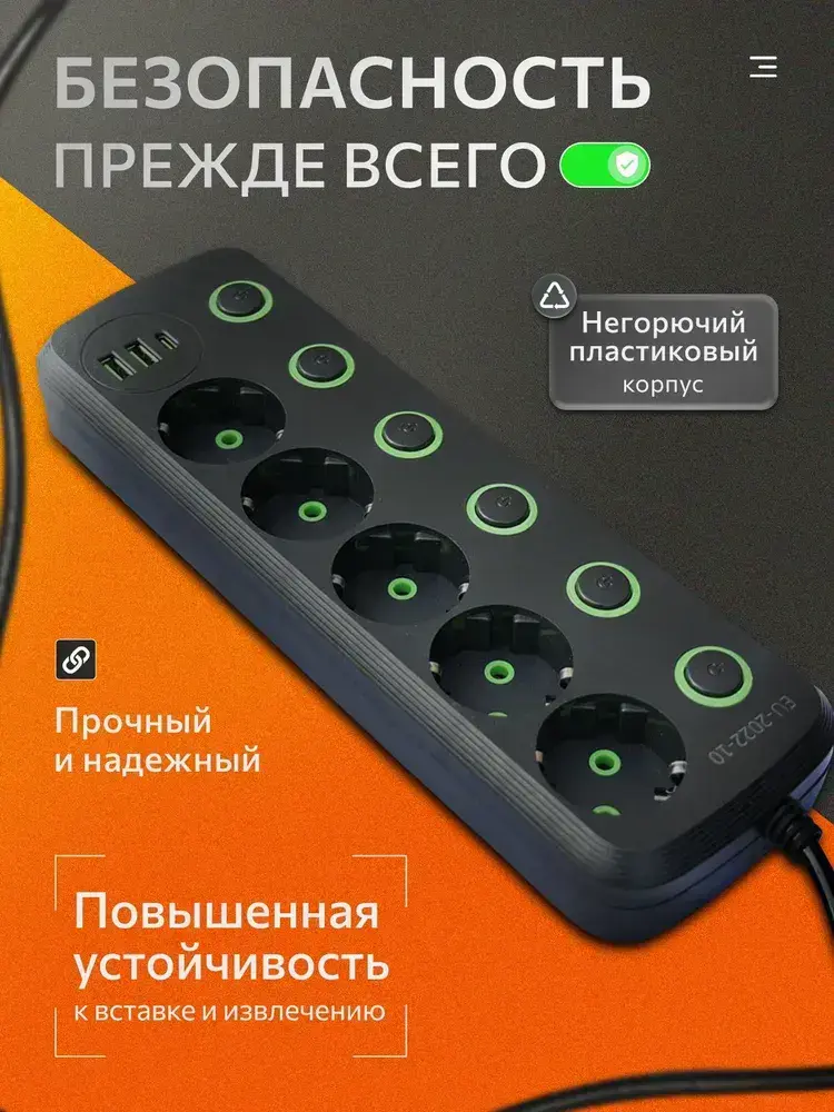 Удлинитель сетевой фильтр 10 метров 5 розеток 3 USB 6 кнопок Черный