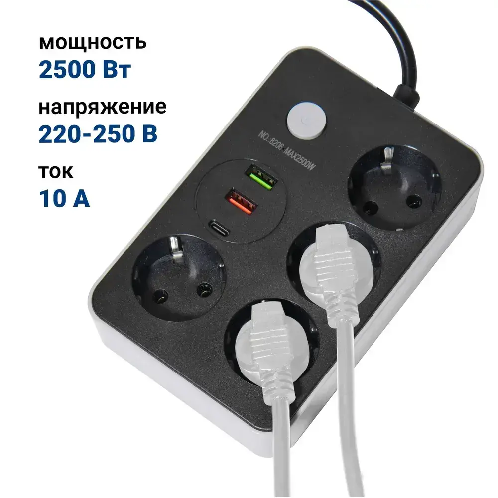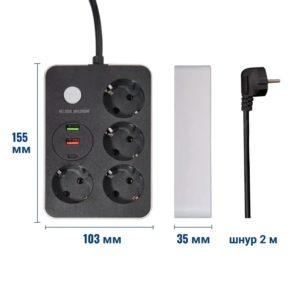 Удлинитель сетевой фильтр электрический на 4 розетки с USB и Type-C, с заземлением и защитой предохранителем, шнур 2 метра