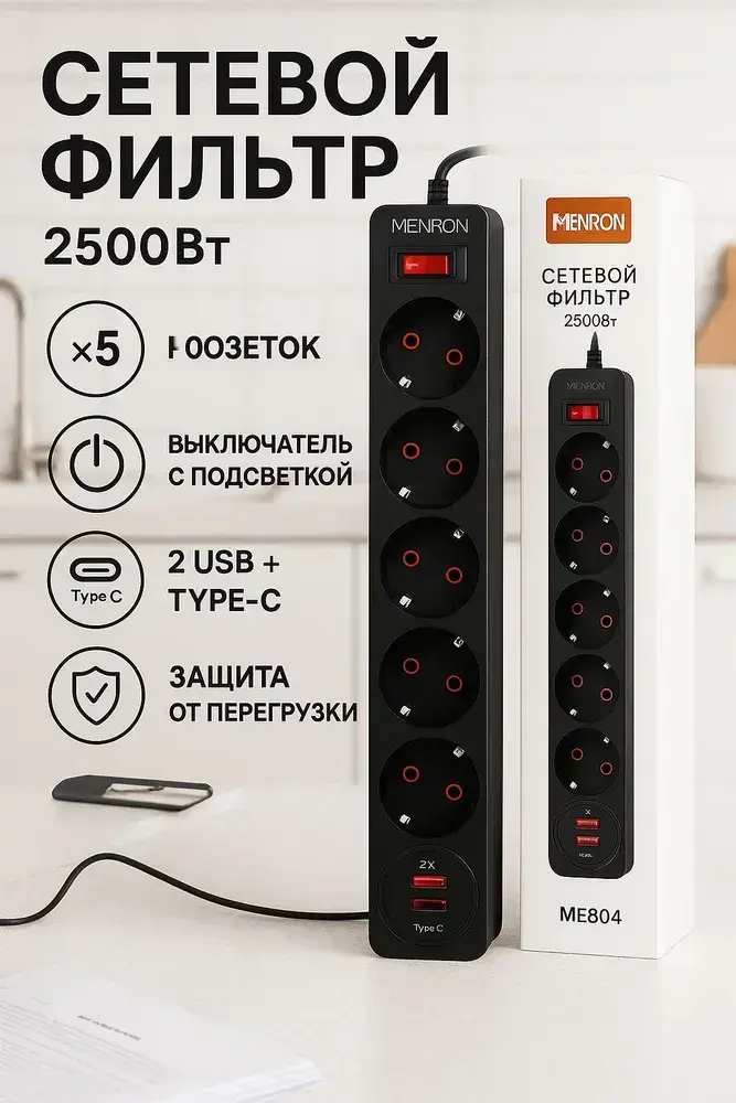 Удлинитель сетевой фильтр с USB 5 розеток и 2 USB, 1 type C, кабель 3м, с выключателем 2500 Вт c быстрой зарядкой авто юсб (пилот)