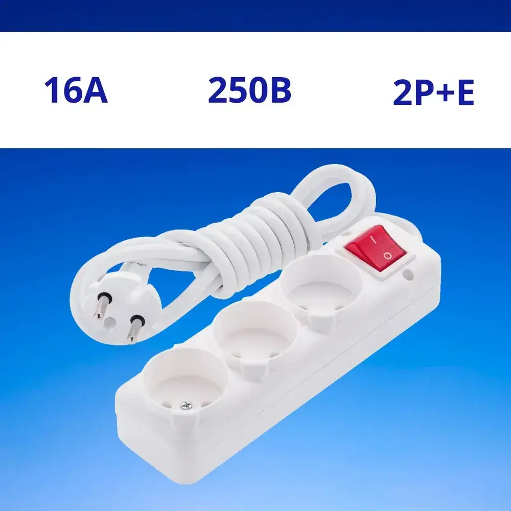 Удлинитель сетевой NE-AD без заземления с выключателем, 3 гнезда, 2 метра