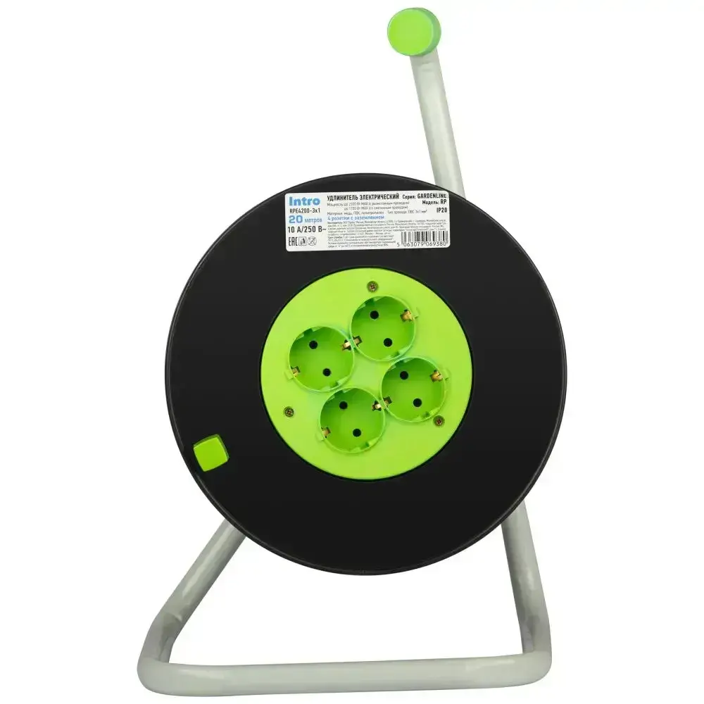 Удлинитель силовой на катушке Intro RPE4200 20м c заземлением 4 розетки ПВС 3х1мм, строительный садовый для газонокосилки и триммера