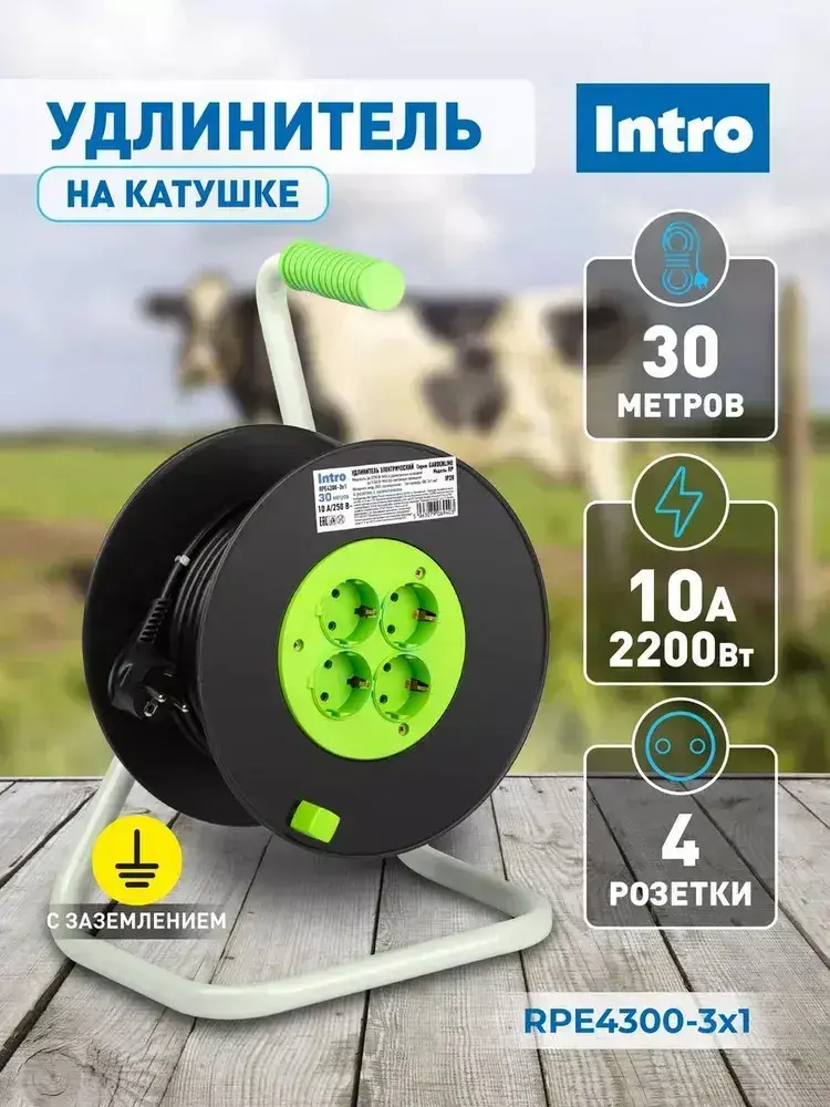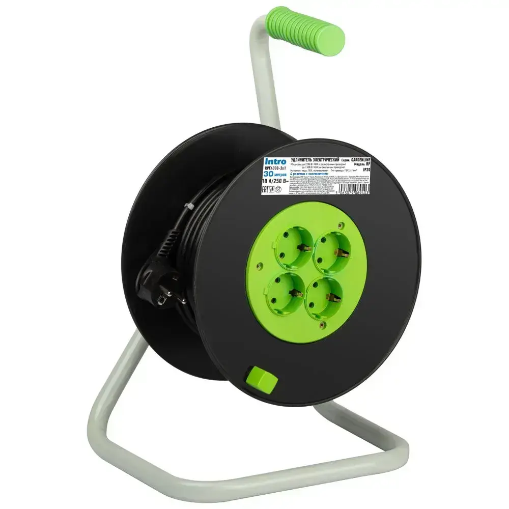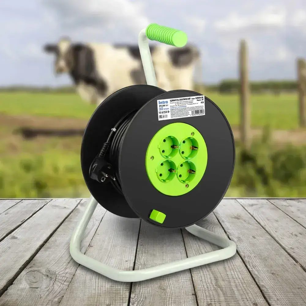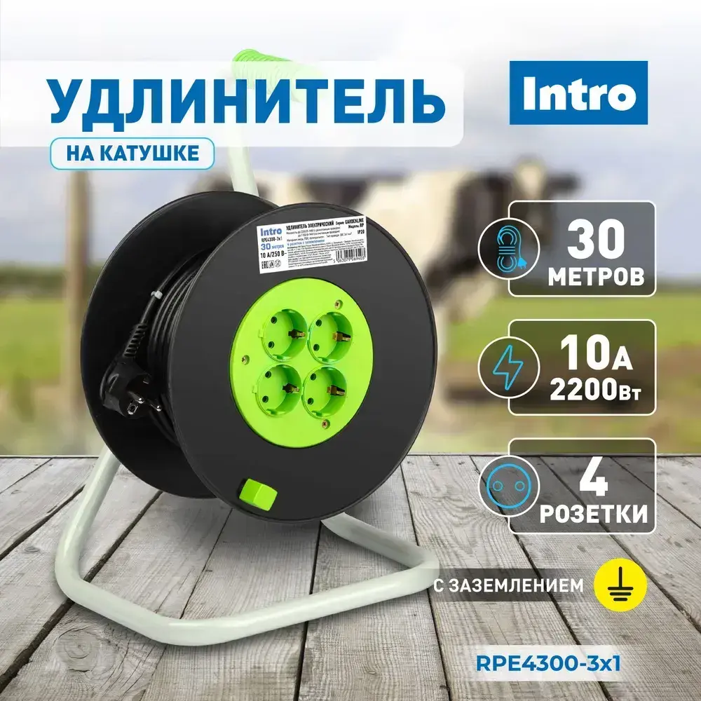 Удлинитель силовой на катушке Intro RPE4300 30м c заземлением 4 розетки ПВС 3х1мм, строительный садовый для газонокосилки и триммера