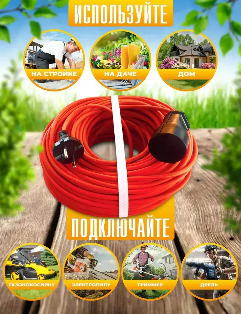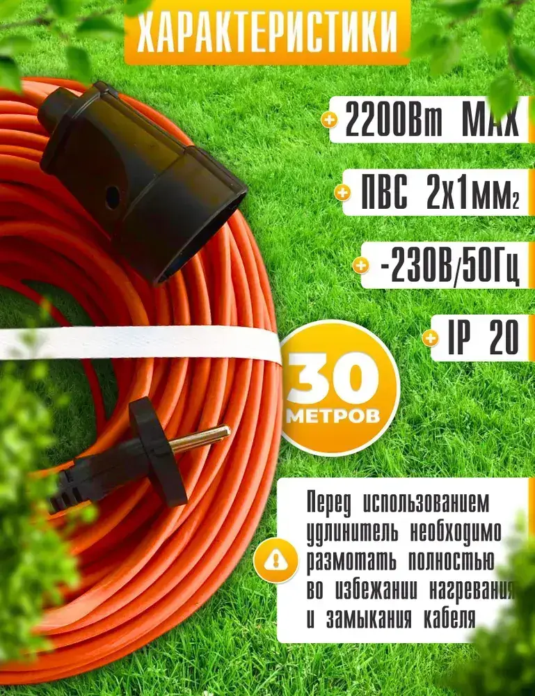 Удлинитель силовой шнур 30м, 1 розетка, ПВС 2*1мм IP20