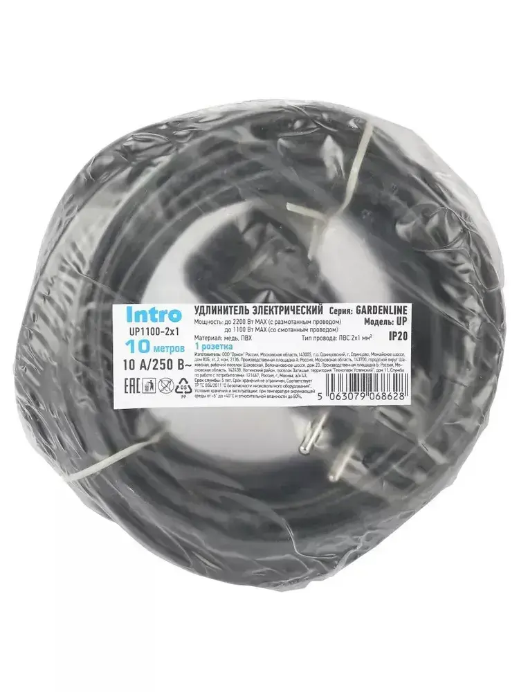 Удлинитель силовой в бухте Intro UP1100 10м без заземления 1 розетка ПВС 2х1мм, строительный садовый для газонокосилки и триммера