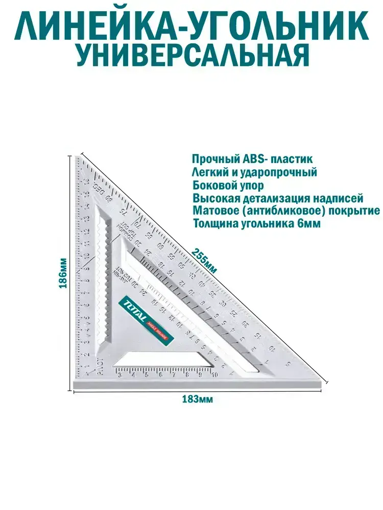 Угольник строительный. TOTAL Линейка угольник 180мм х 250мм, Пластик.