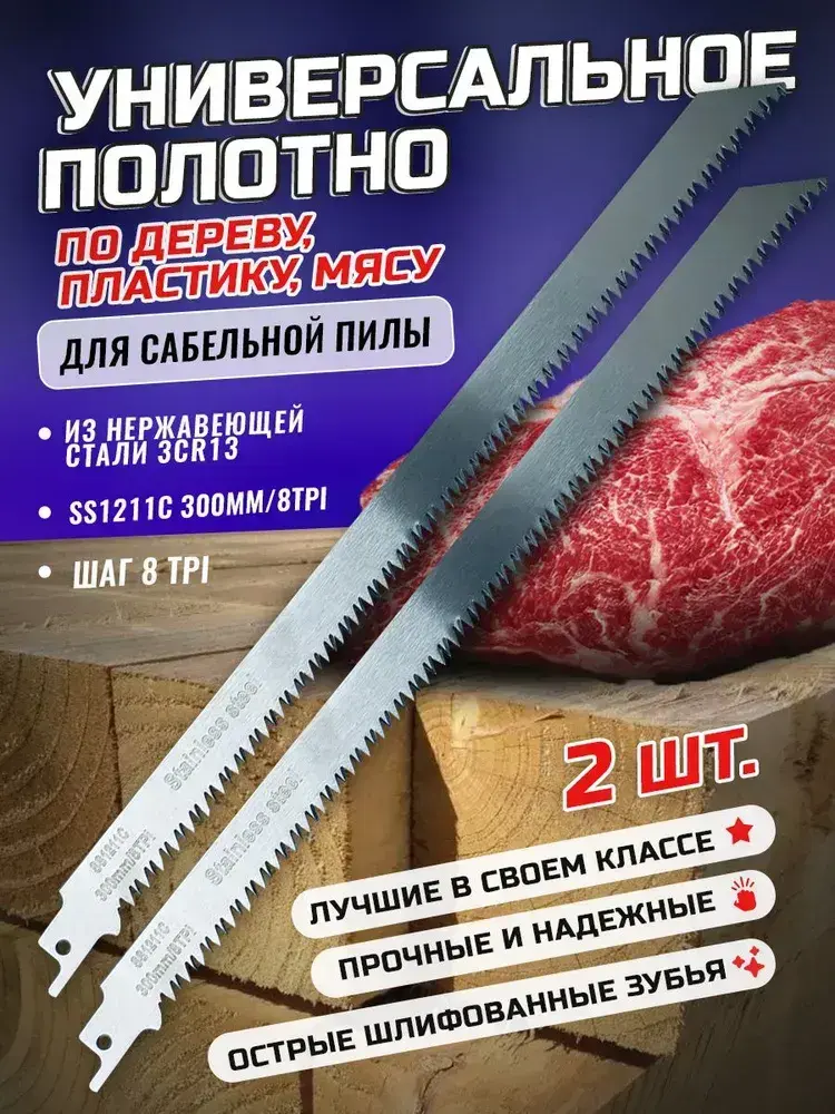 Универсальное полотно 2шт по дереву и мясу 300мм для сабельной пилы SS1211C