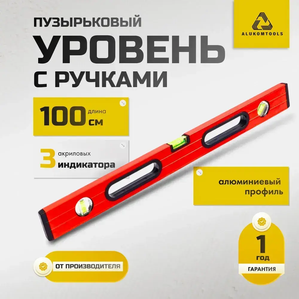 Уровень строительный с ручками 100 см, окрашенный, ALUKOMTOOLS
