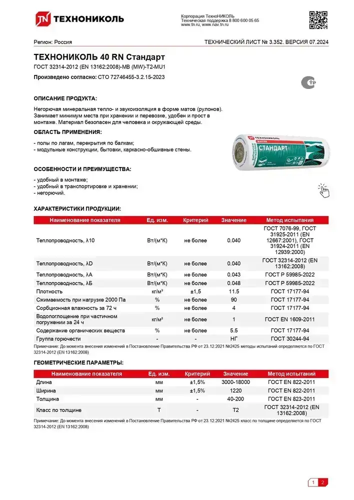 Утеплитель в рулоне 45м2 (6 рулонов) минеральная вата 100мм Технониколь Стандарт 40RN для стен, кровли, перекрытий