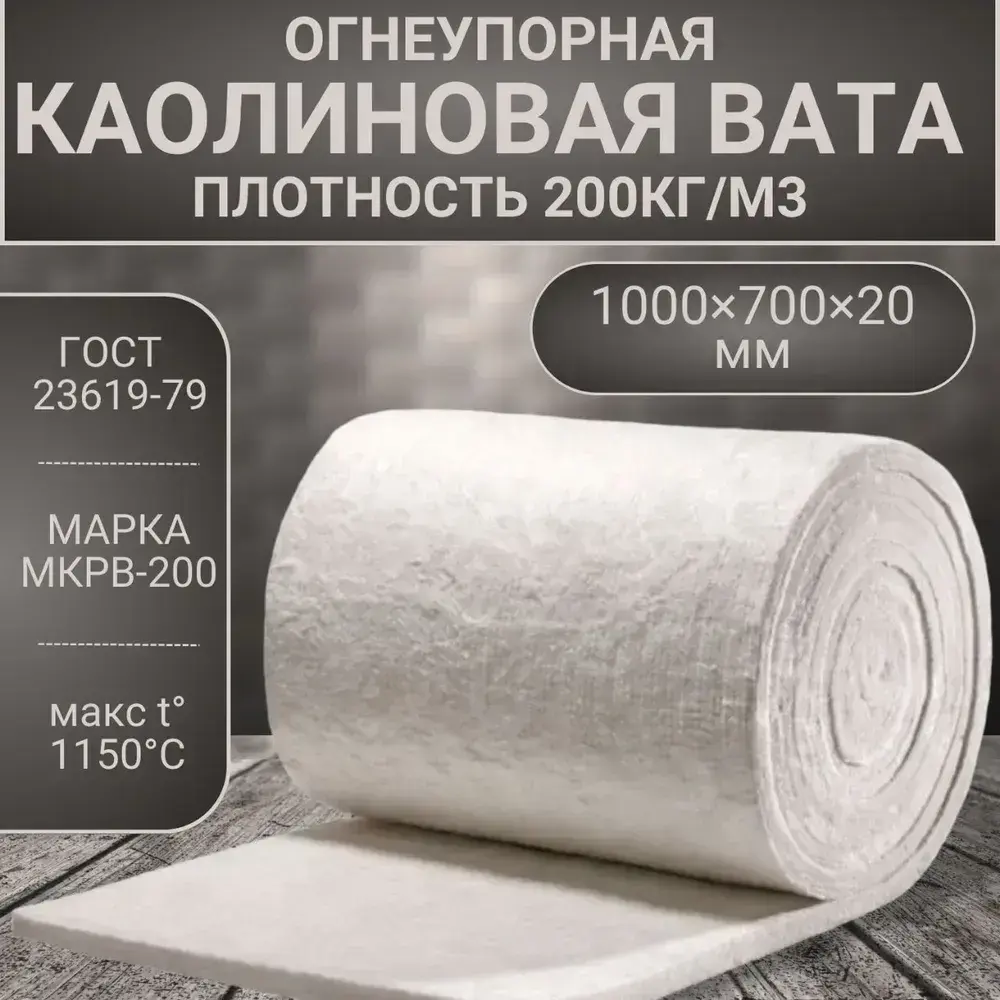 Вата каолиновая огнеупорная МКРВ-200, 1000х700х20мм, ГОСТ, одеяло огнеупорное, теплоизоляция для печей, труб, котлов, каминов