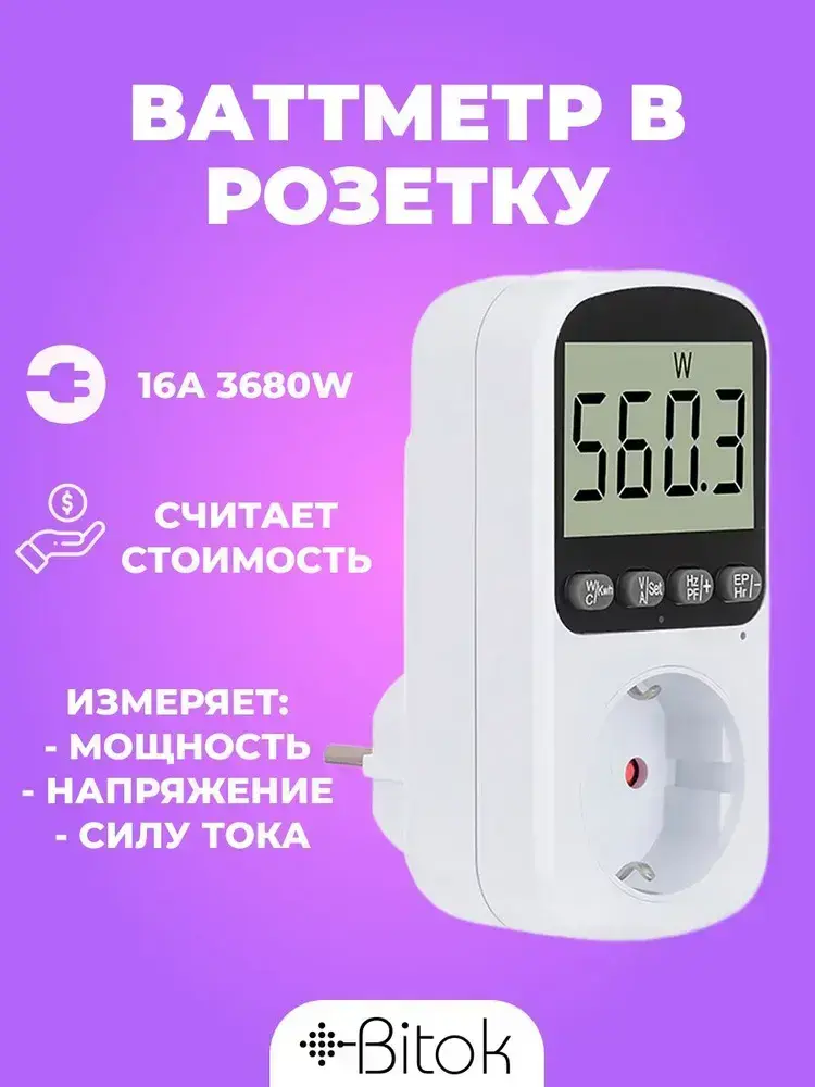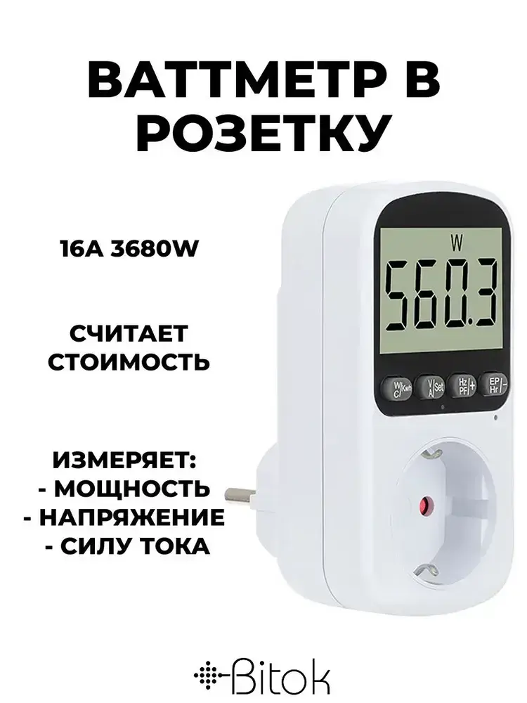 Ваттметр в розетку цифровой Bitok PM11, счетчик контроль потребления электроэнергии