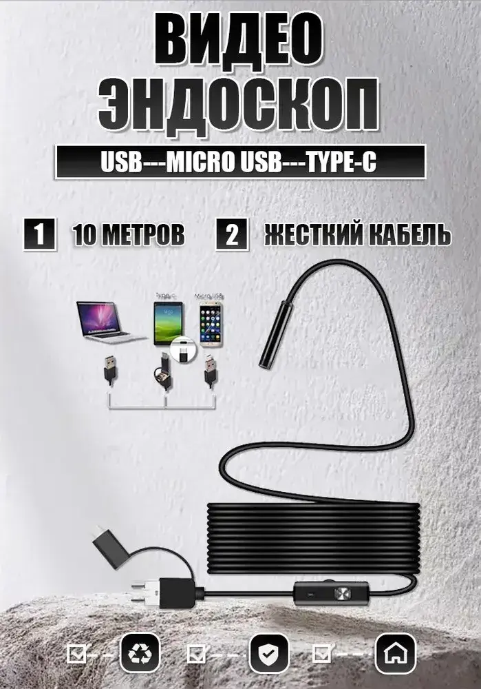 Видеоэндоскоп ATR для смартфона и ПК. USB / Micro USB / Type-C, 10 метров, Водонепроницаемый (мягкий кабель)