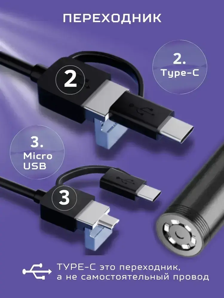 Видеоэндоскоп для смартфона / Эндоскоп ГИБКИЙ и для компьютера для Android, 2 метра, microUSB, USB, Type-S водонепроницаемый, для телефона и смартфона.