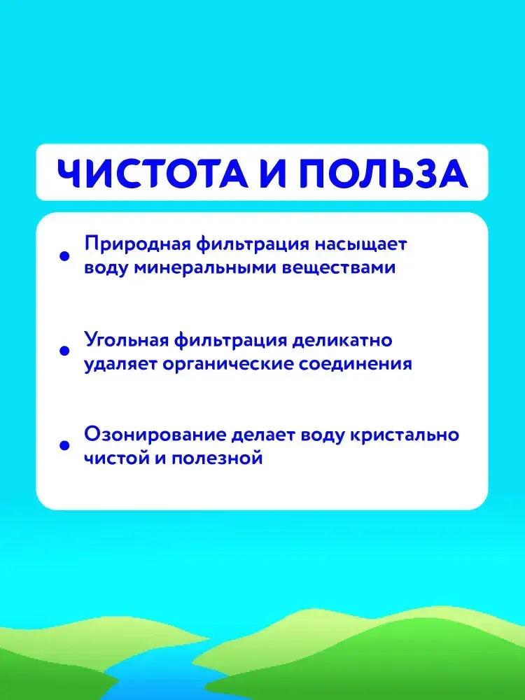 Каждая капля воды Черноголовка негазированная очищается природными фильтрами, многовековыми слоями песка и обогащается полезными минеральными веществами, соотношение которых органично сбалансировано самой природой.