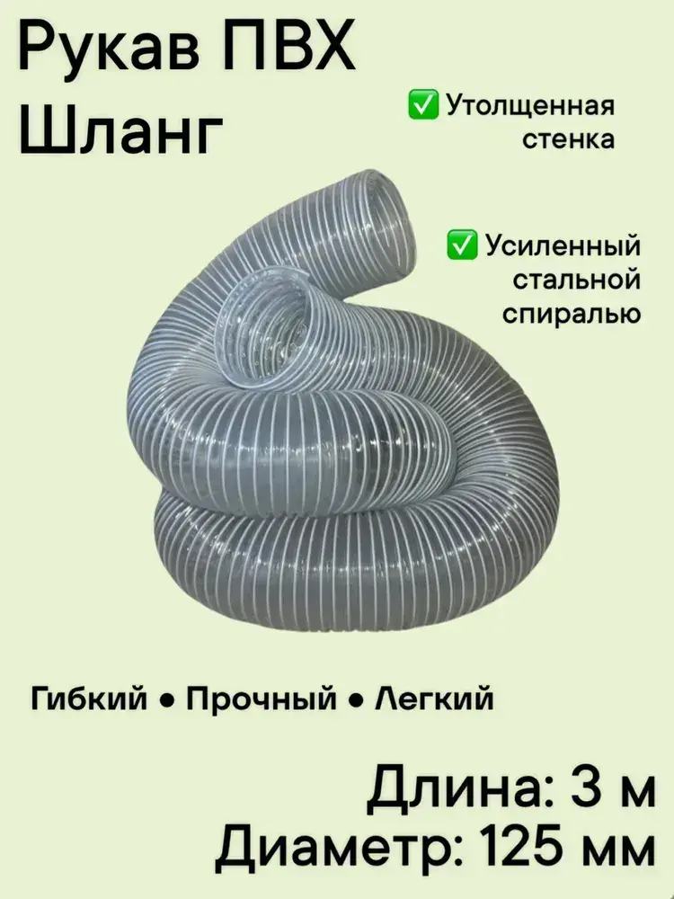 Воздуховод шланг рукав ПВХ 125 мм армированный проволокой шланг 3 м для аспирации стружкоотсоса и вытяжки
